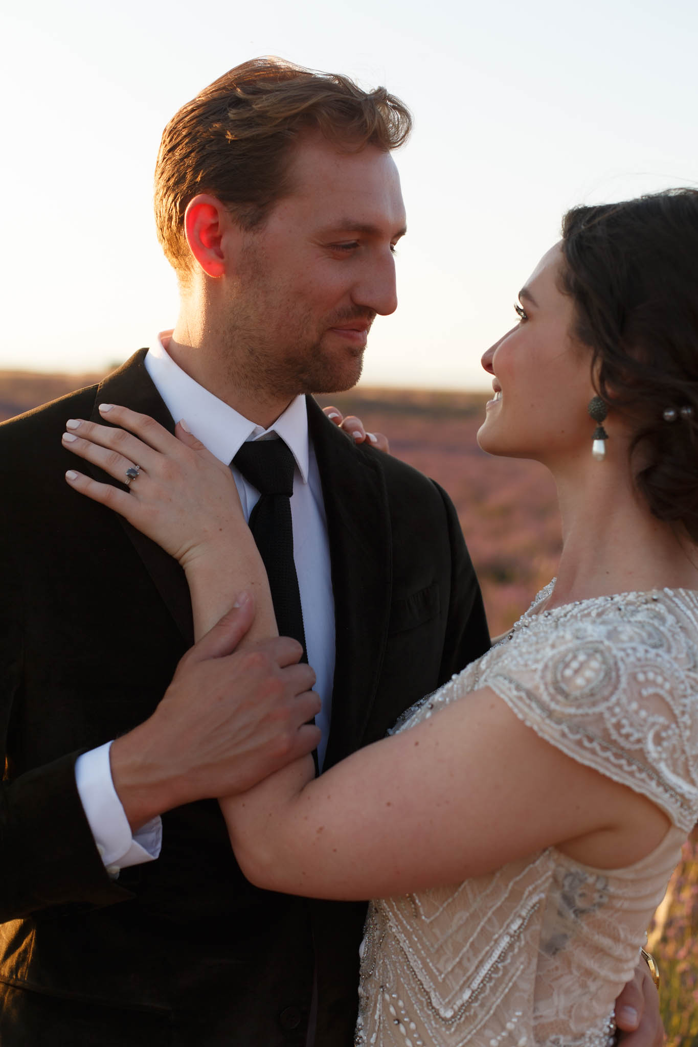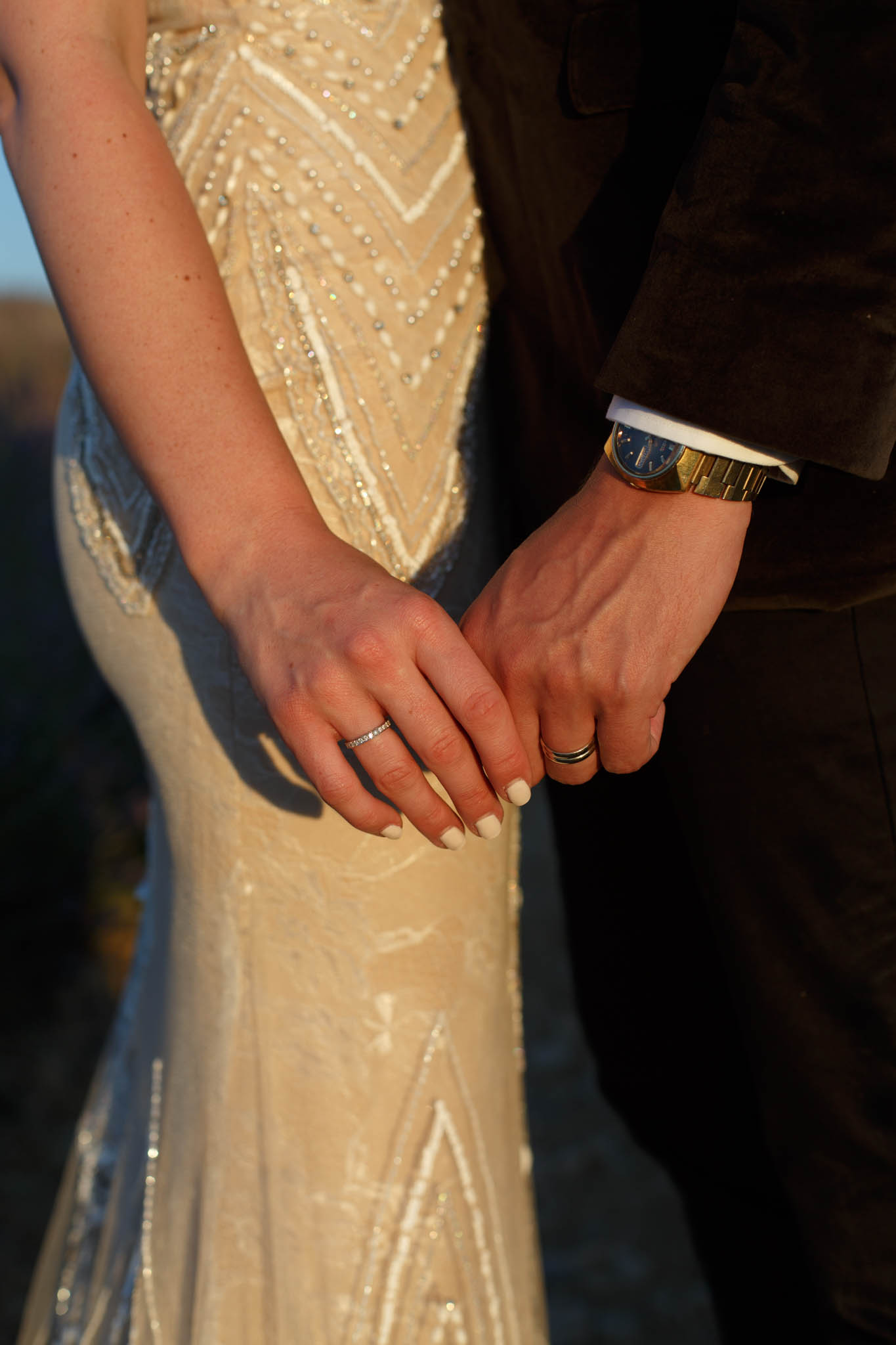 As the sun set behind them, the sky turned warm and glowing, creating a magical atmosphere that perfectly matched the intimacy of their elopement.
