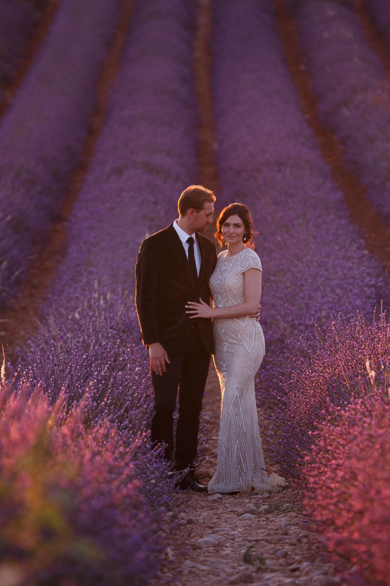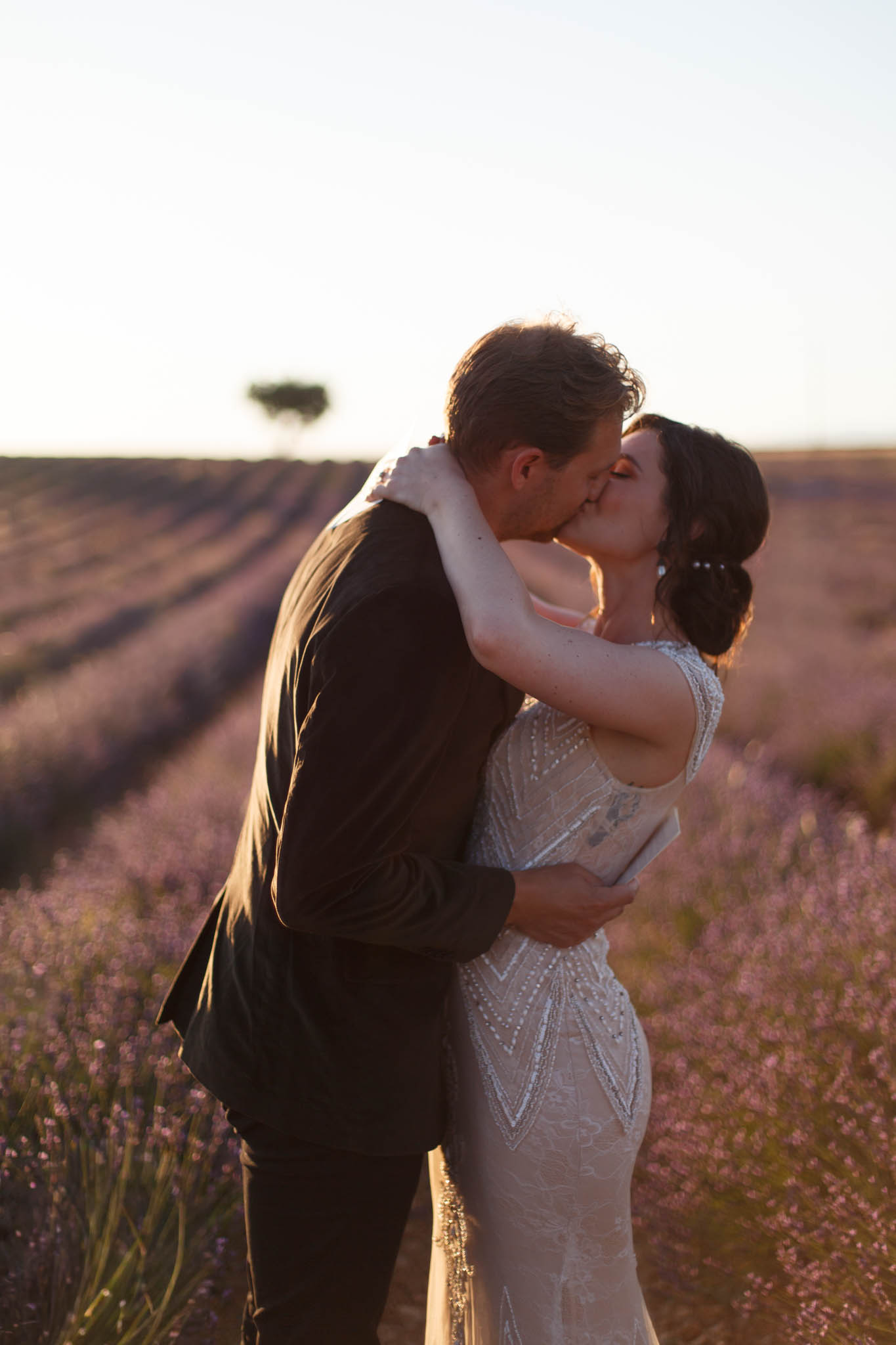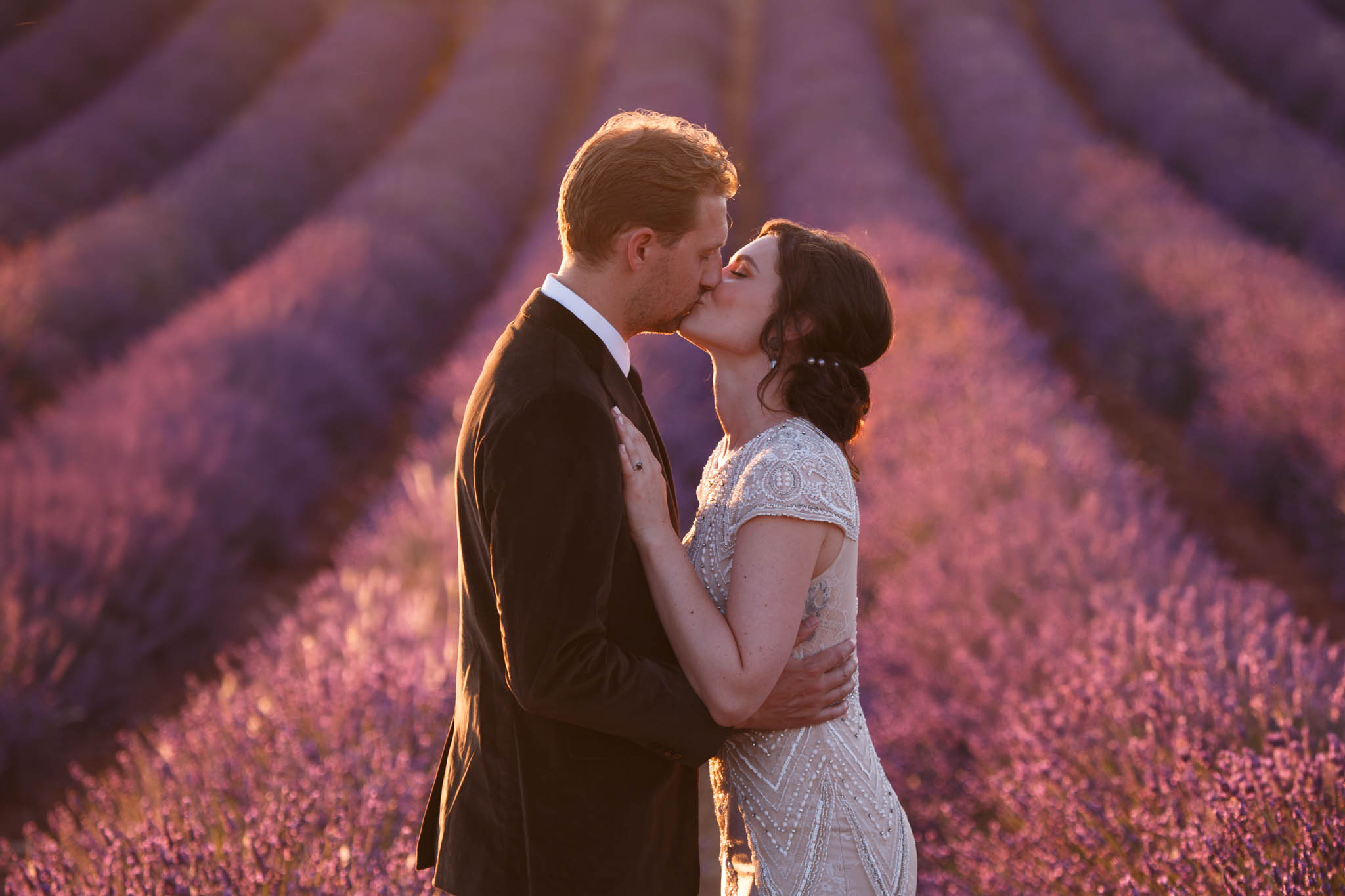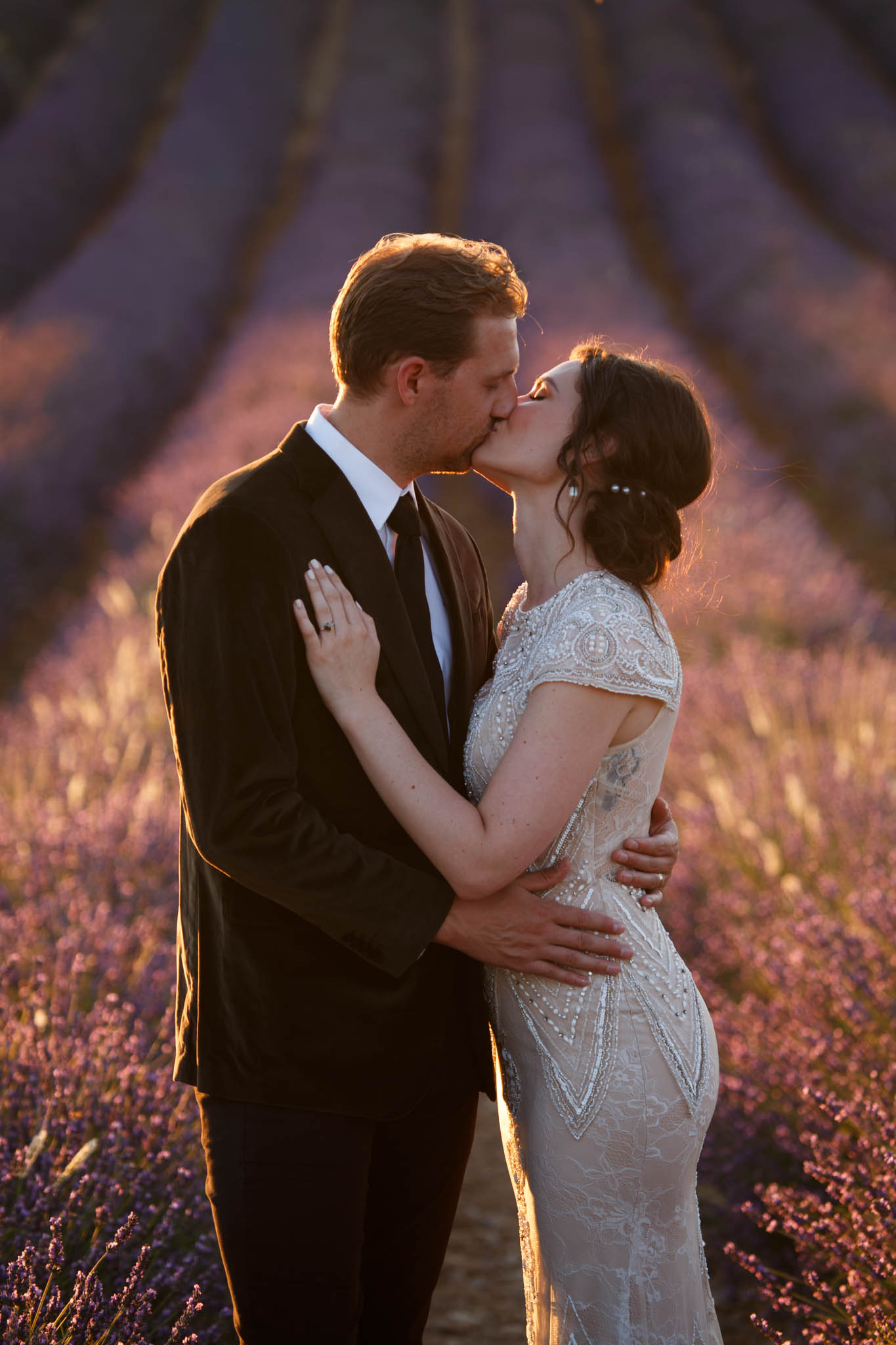 In early July, from 20:00 to 21:00, we photographed B and R during an intimate sunset elopement in Lavandes Angevin, near Valensole in Provence.