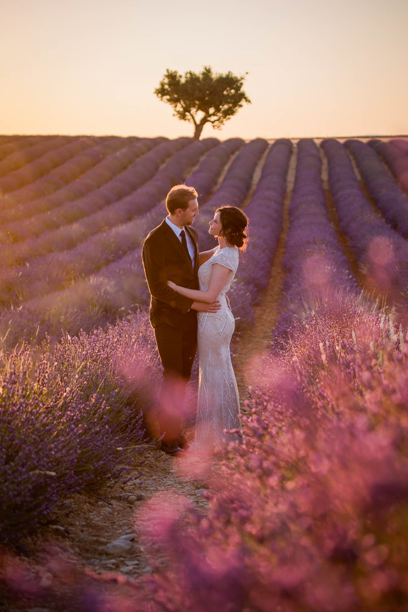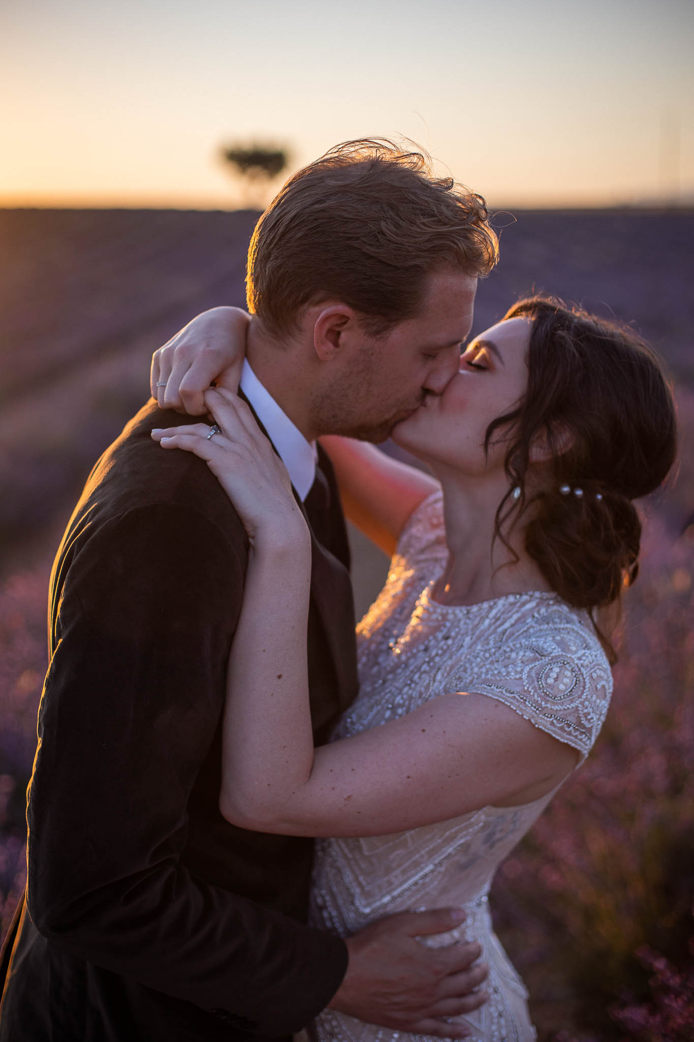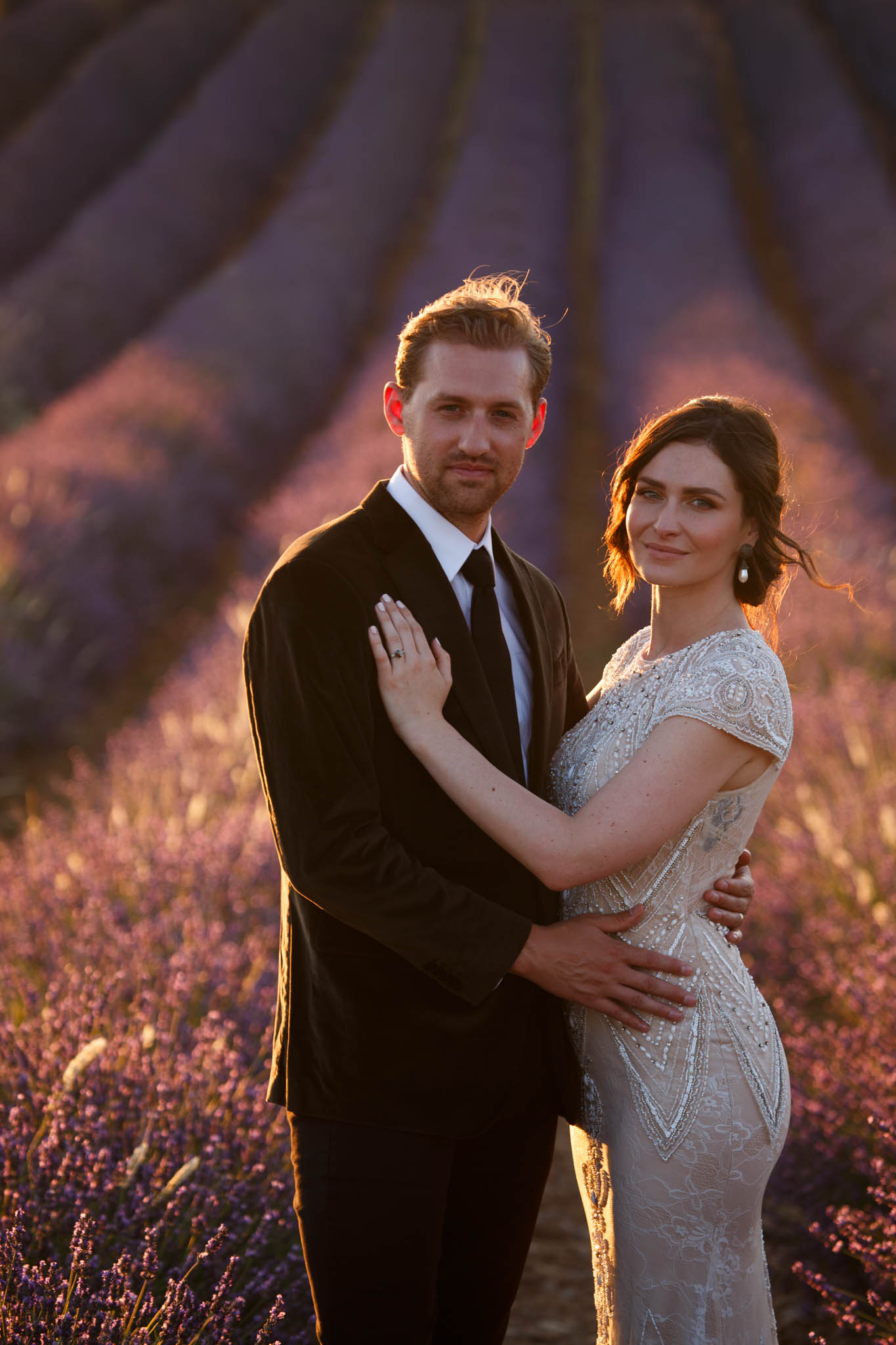 In early July, from 20:00 to 21:00, we photographed B and R during an intimate sunset elopement in Lavandes Angevin, near Valensole in Provence.