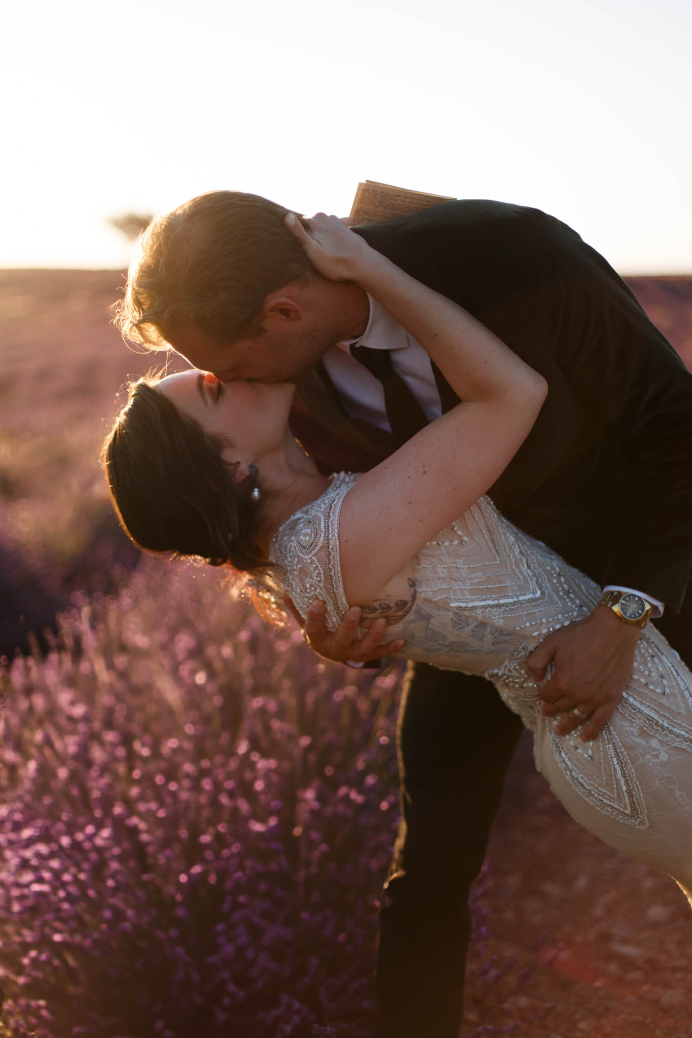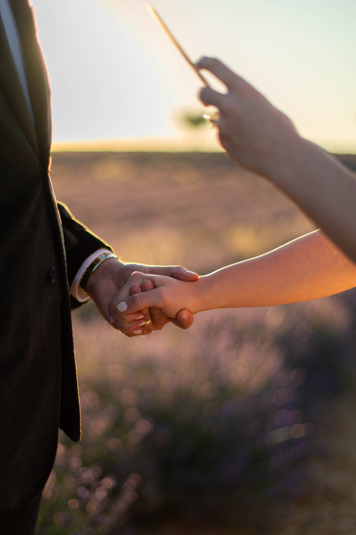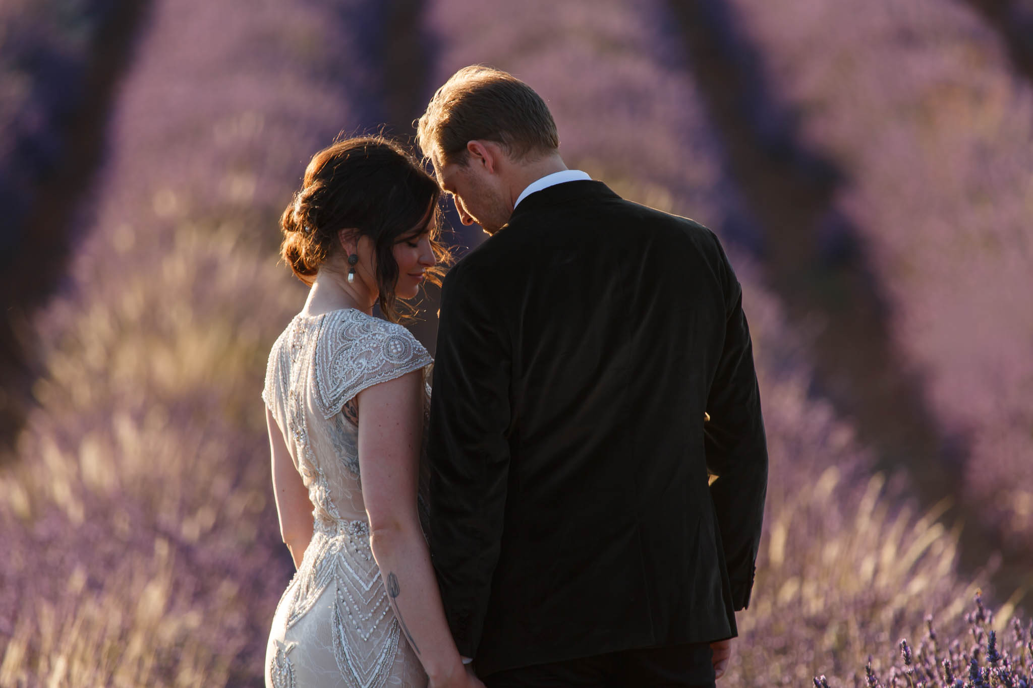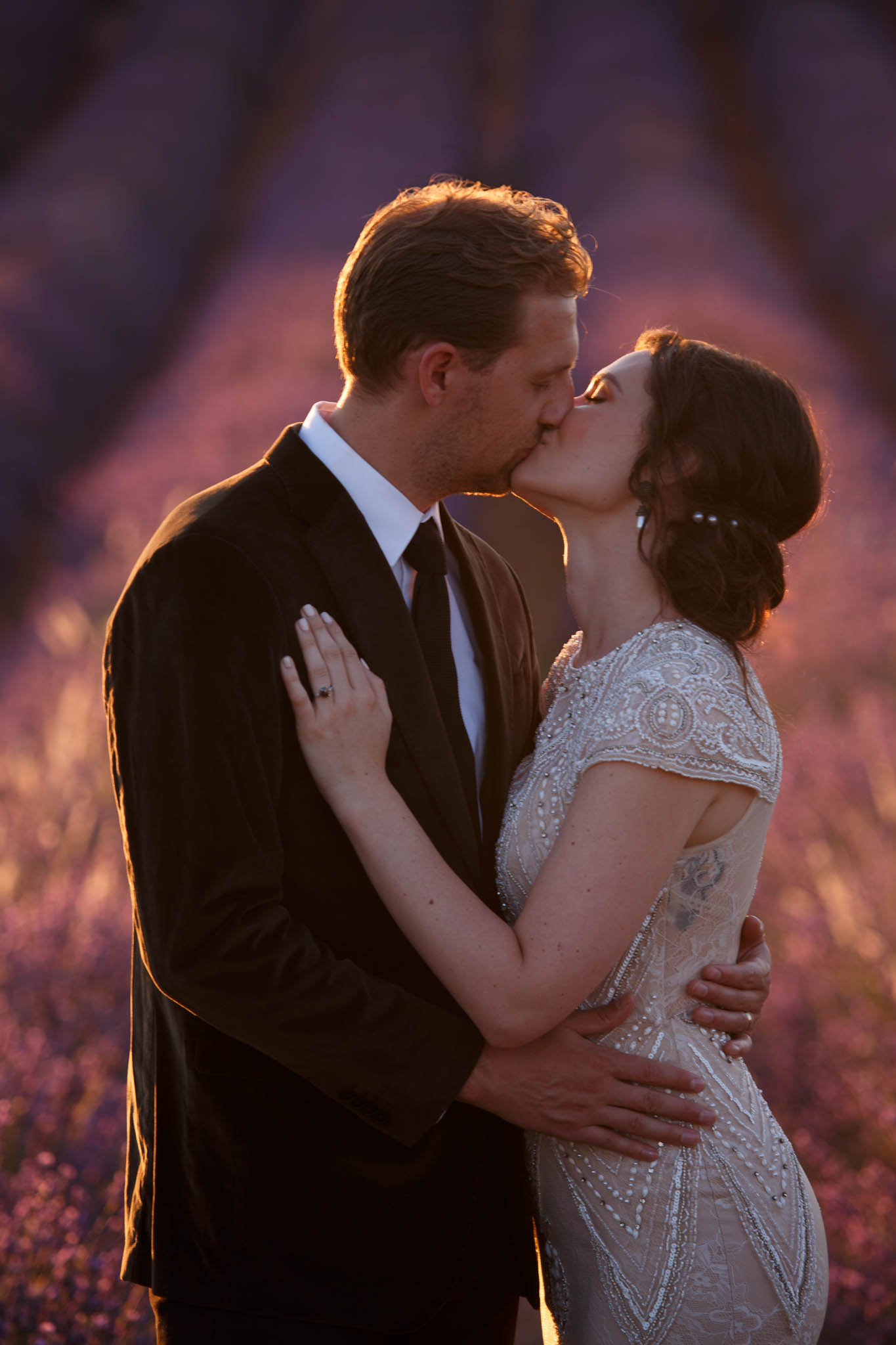 In early July, from 20:00 to 21:00, we photographed B and R during an intimate sunset elopement in Lavandes Angevin, near Valensole in Provence.
