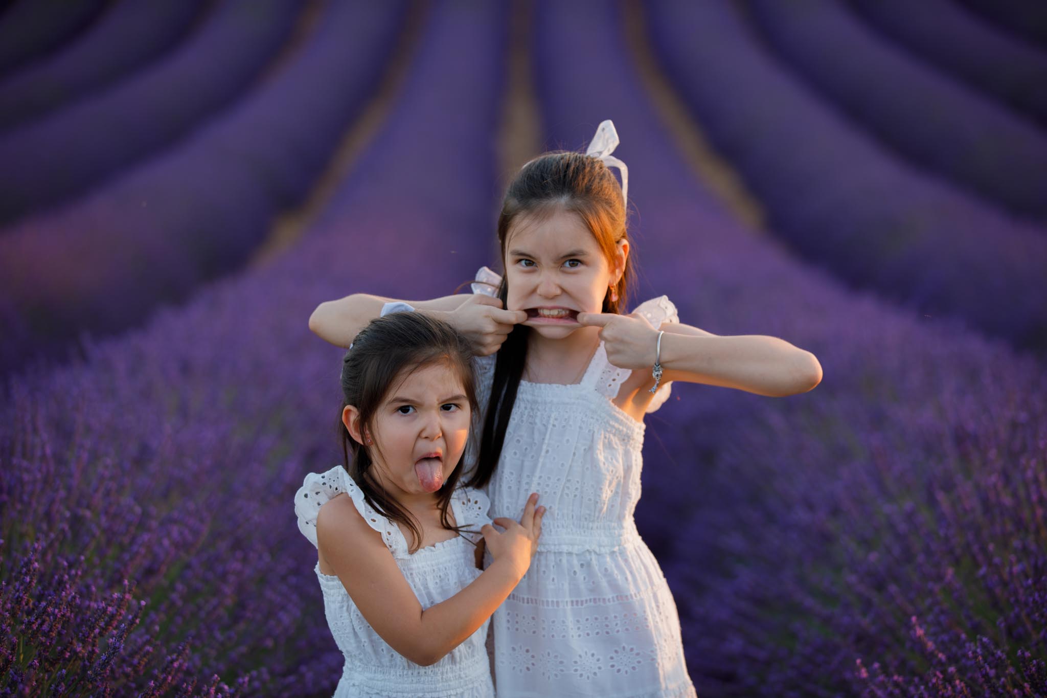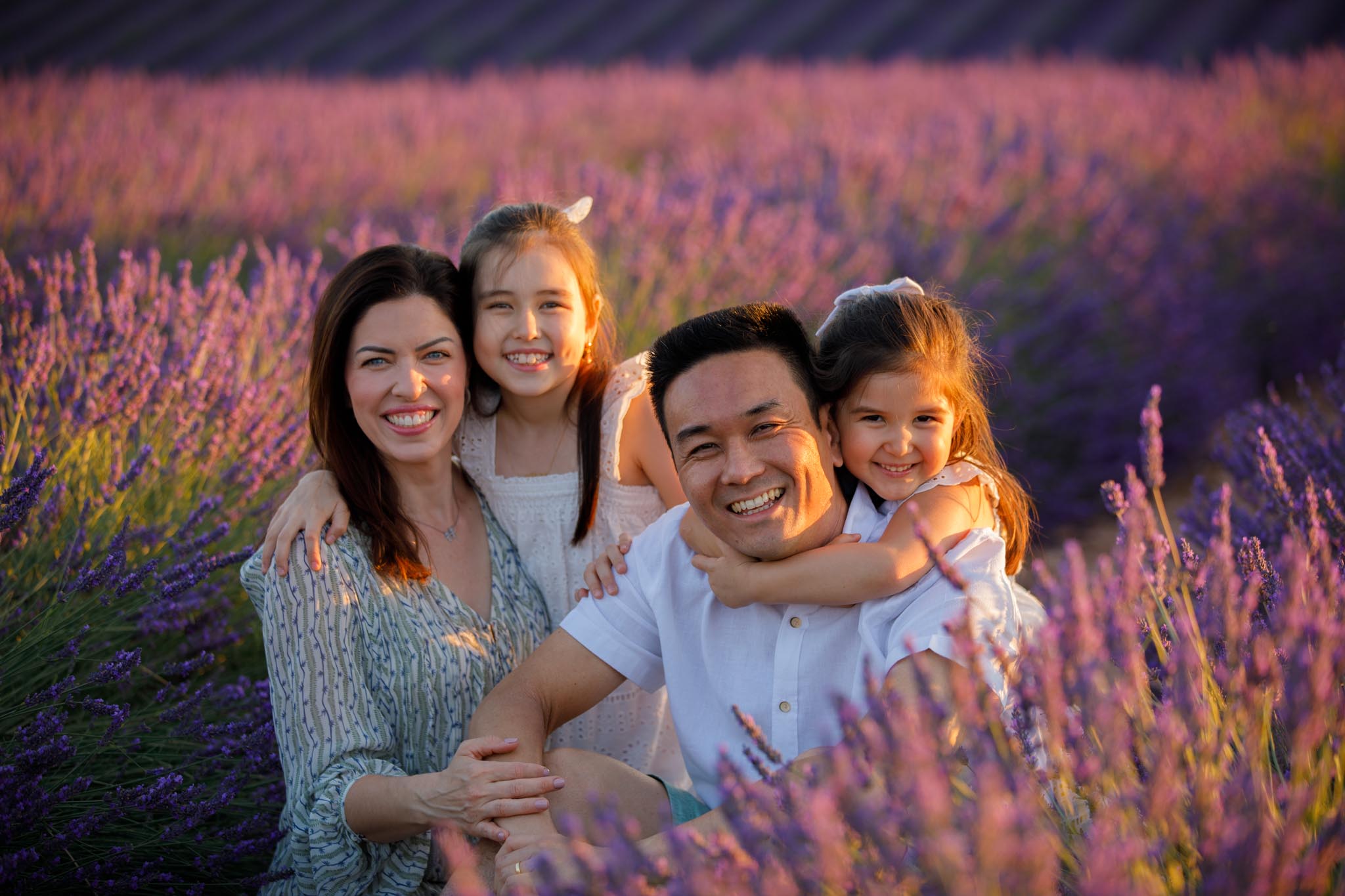 The session included a variety of setups: solo portraits of each child, the siblings together, dad’s portraits, mom’s portraits, parents together, and playful family shots with the kids. The lavender fields added a stunning backdrop, and the sunset cast warm orange tones that enhanced the colours and created a magical atmosphere.