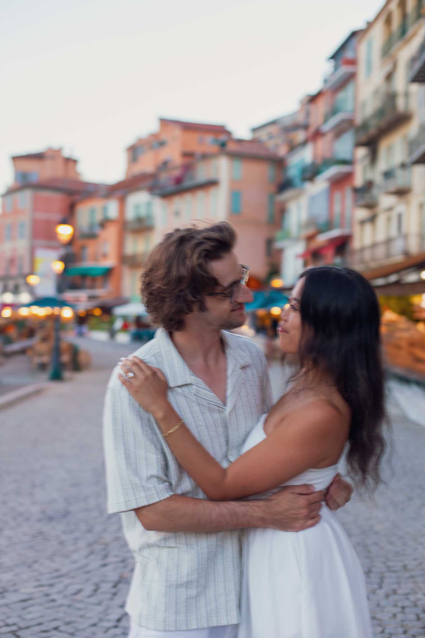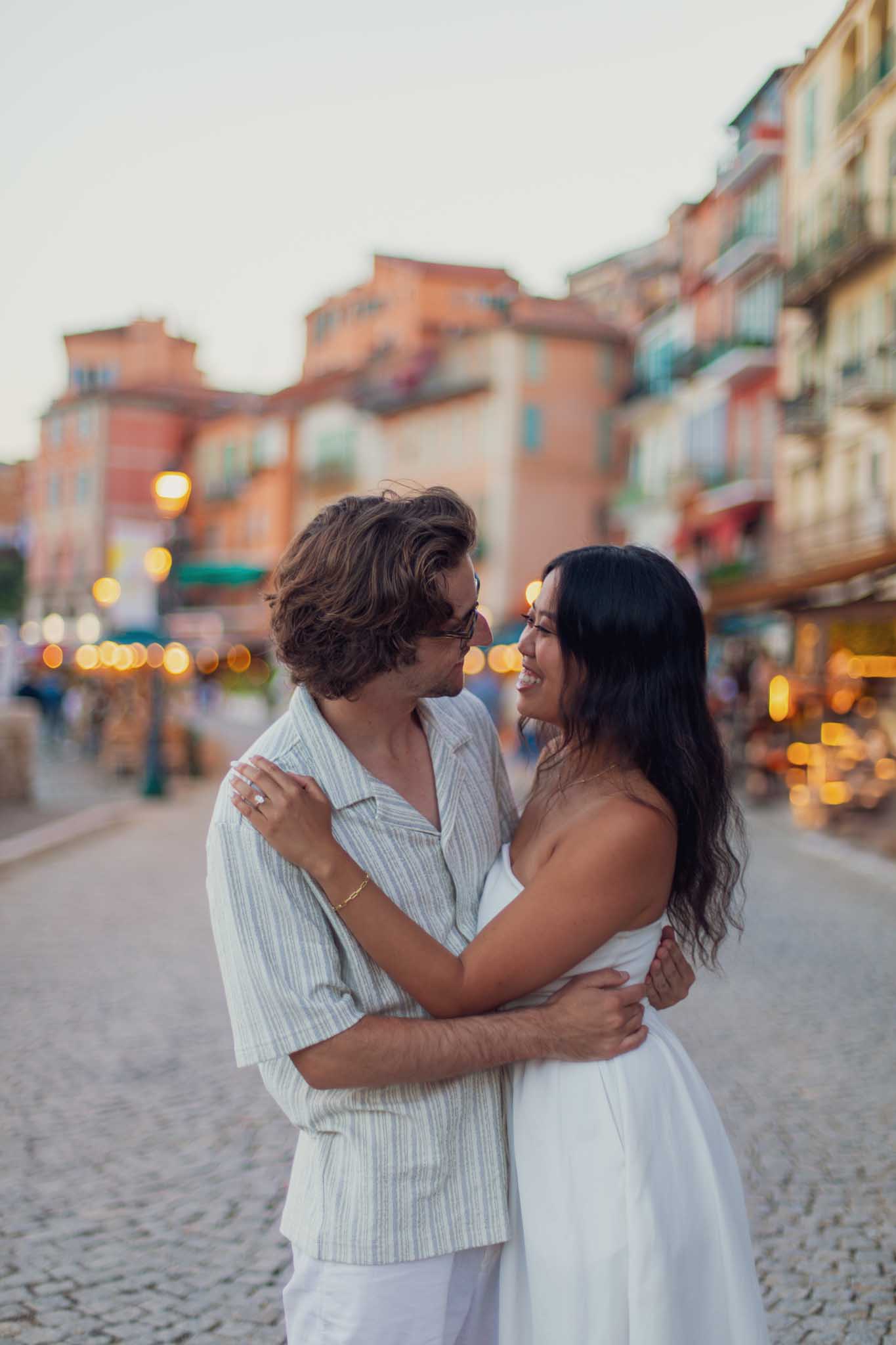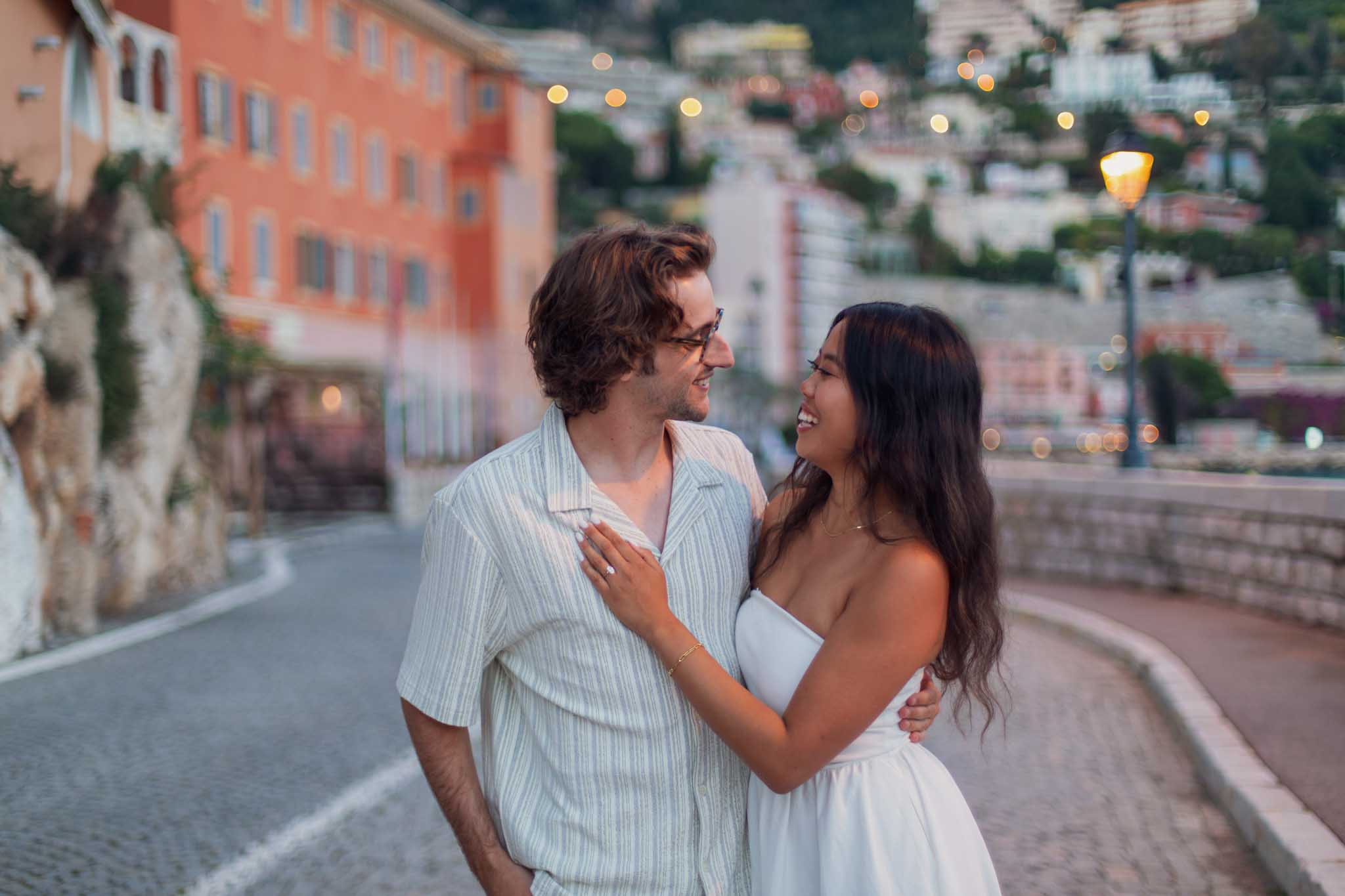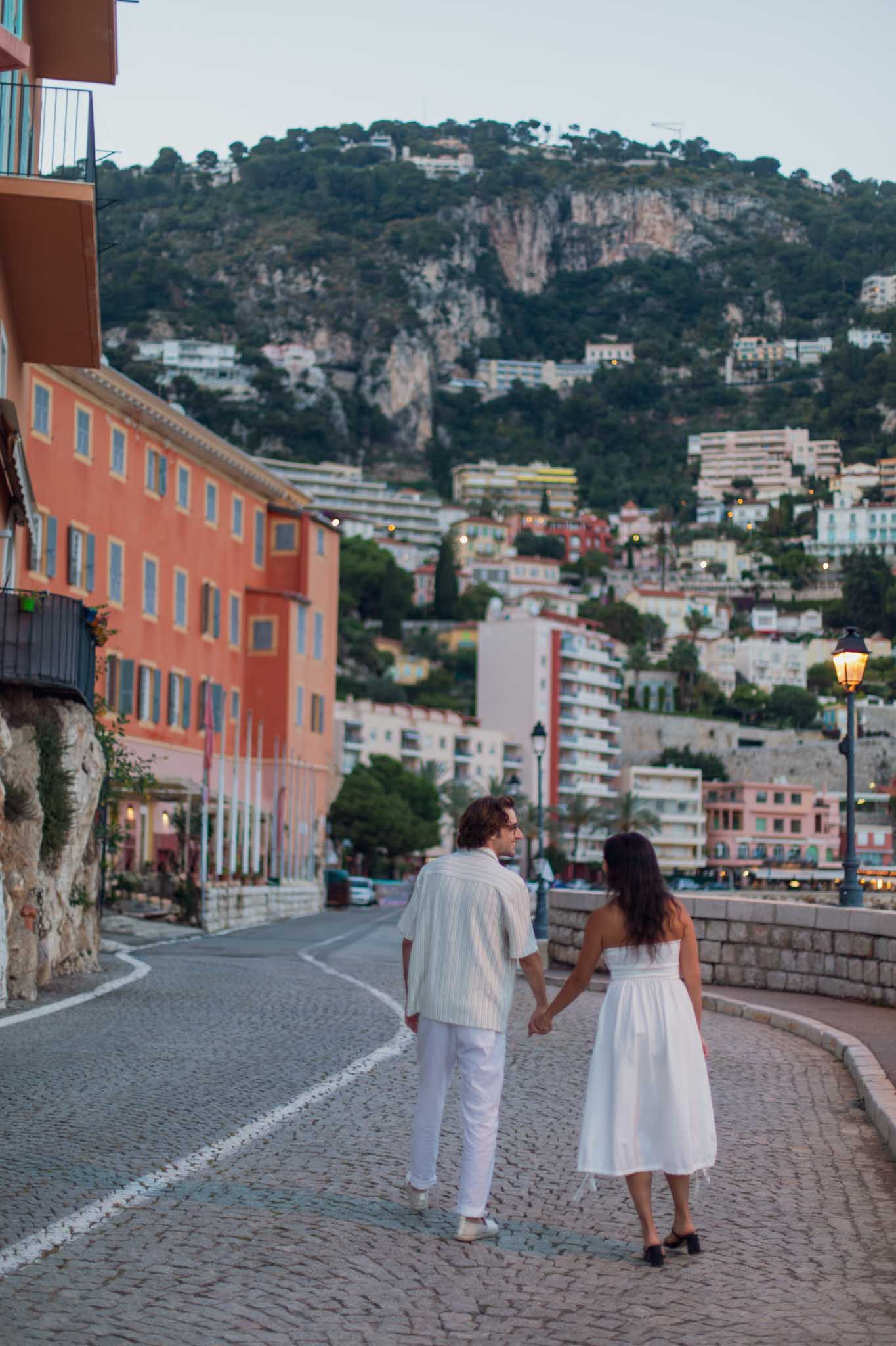 This proposal took place on May 23rd, which falls in late spring on the French Riviera. The weather was mild and comfortable, making it an excellent time of year for an outdoor evening proposal and walk through the town.