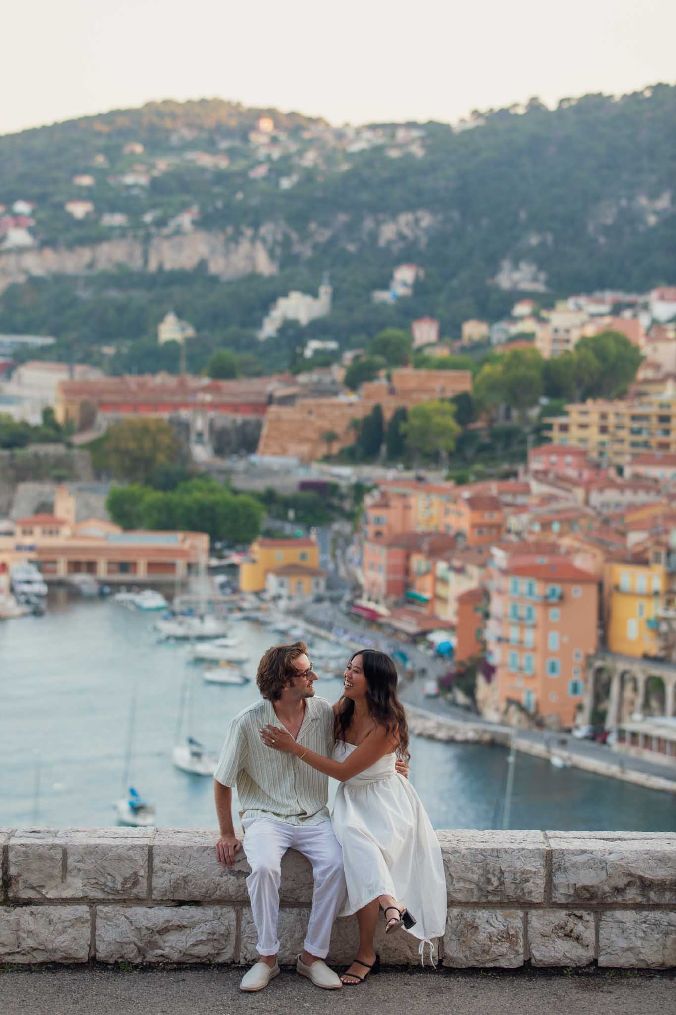 The chosen location was a quiet walkway leading up to a street with a panoramic view over the Villefranche-sur-Mer harbour. From this viewpoint, the entire bay opens up, with the town, sea, and boats all visible below. The proposal took place just before sunset, with soft, warm light filling the scene. The timing allowed for privacy while still taking advantage of the golden evening tones.