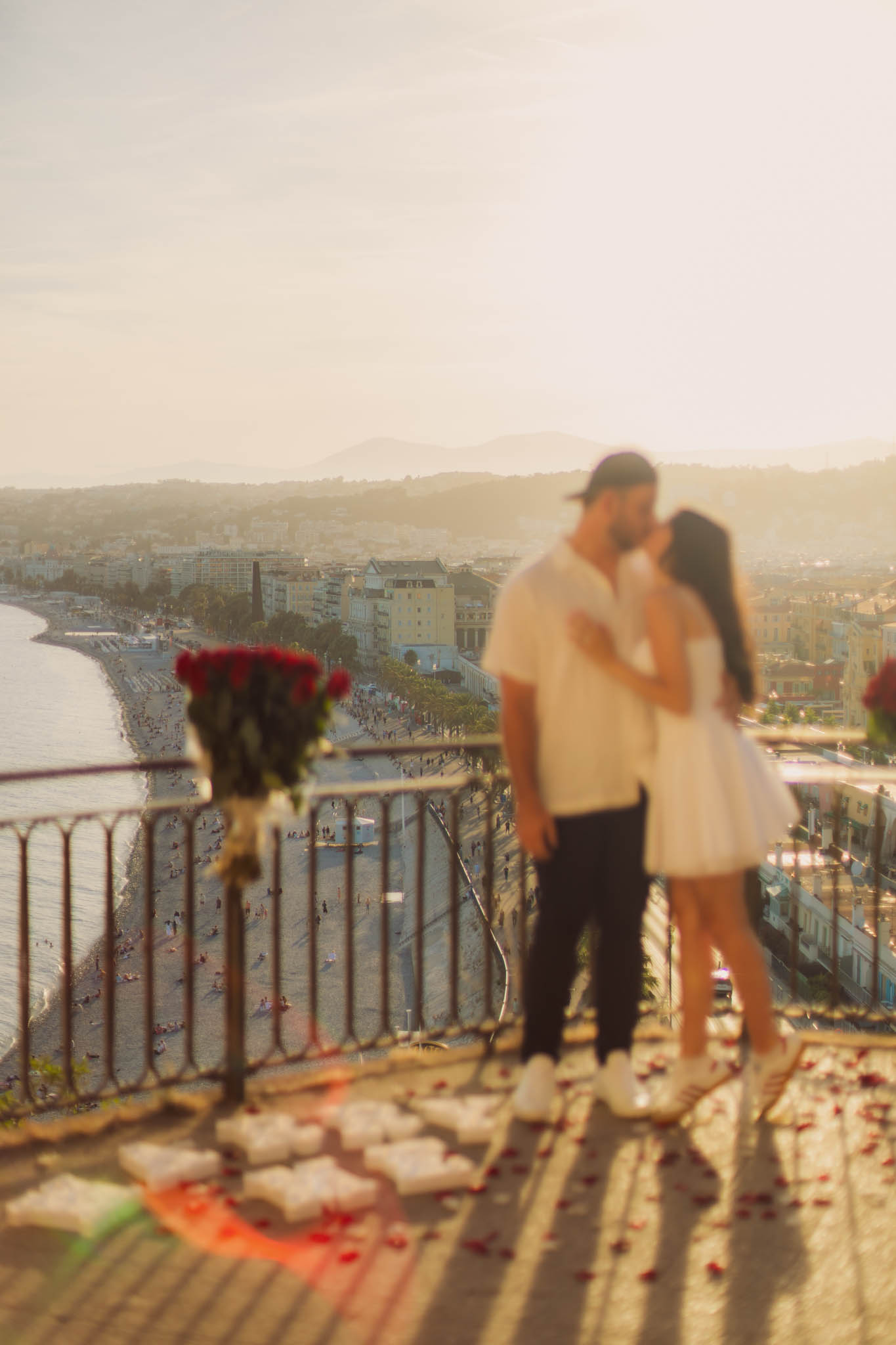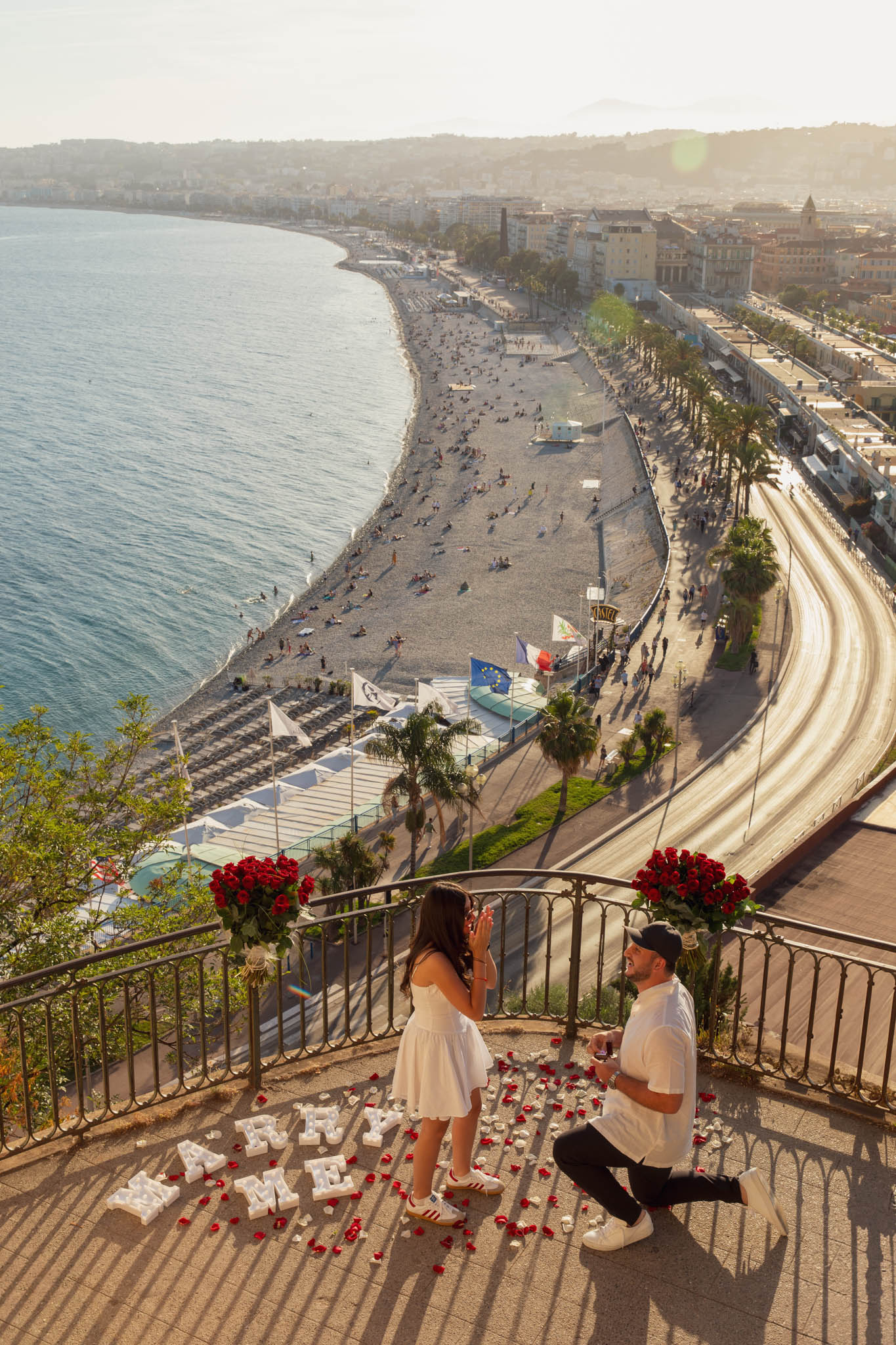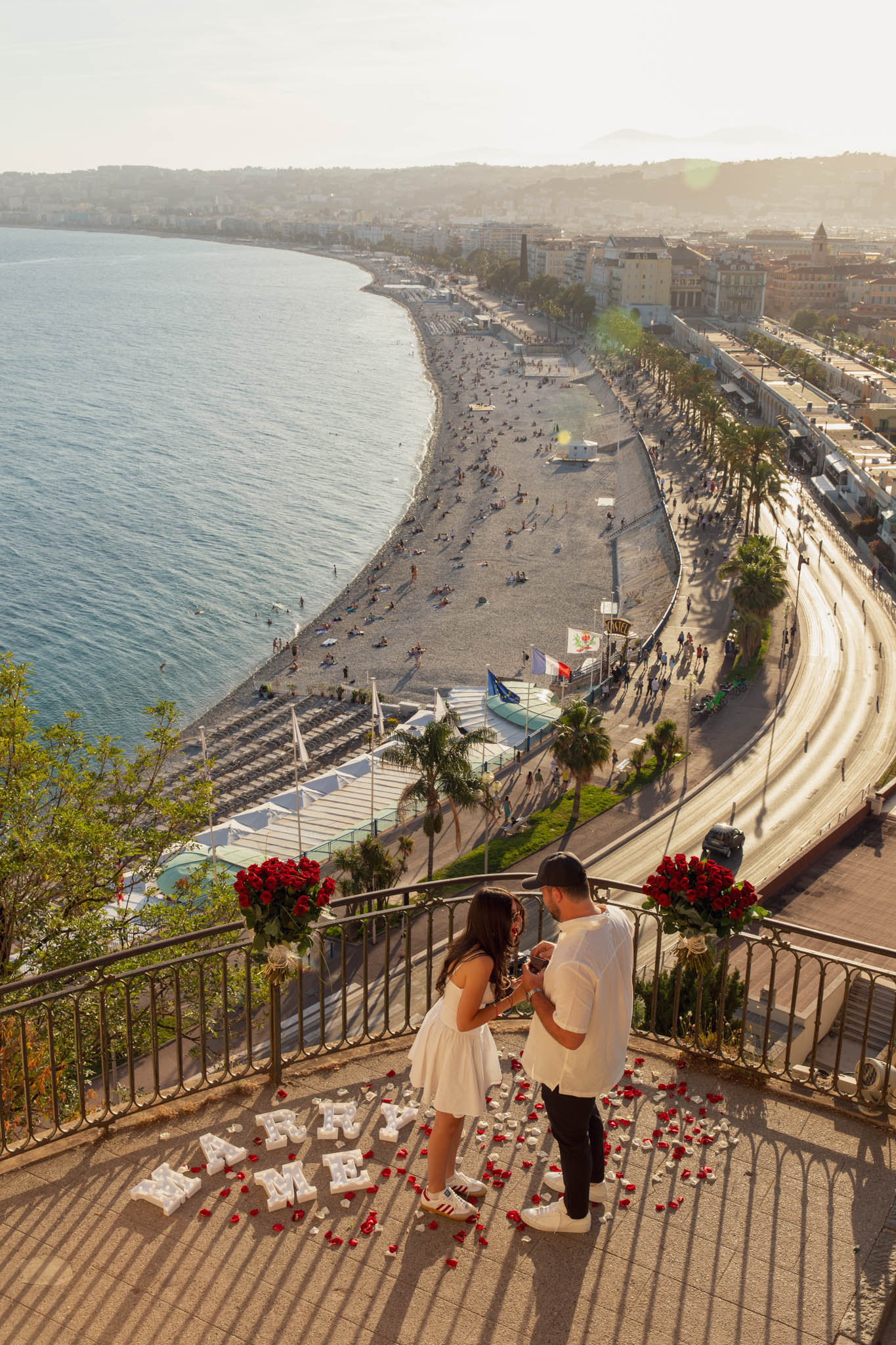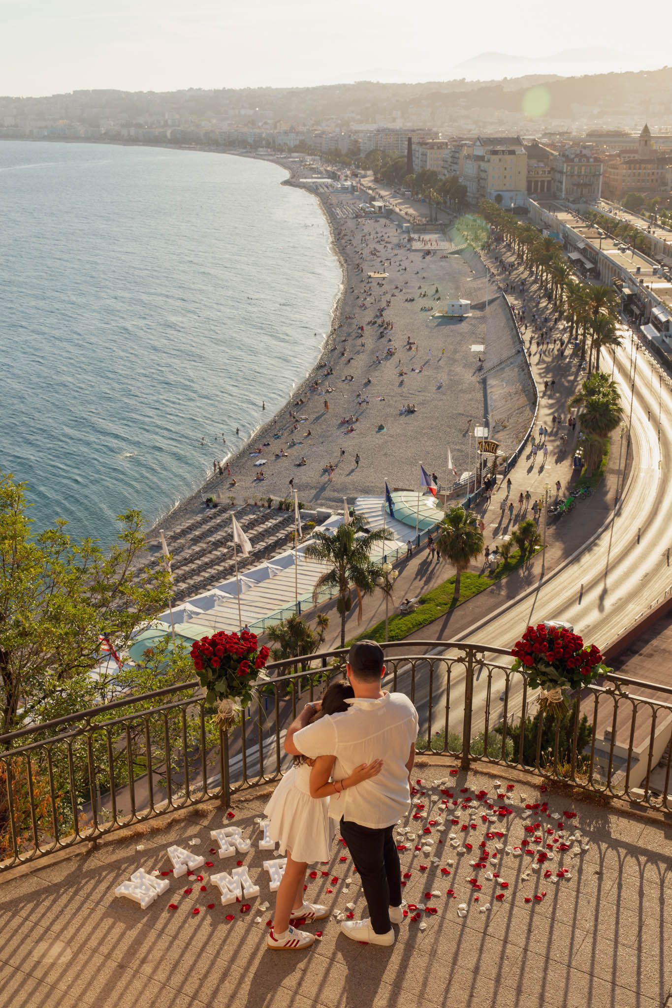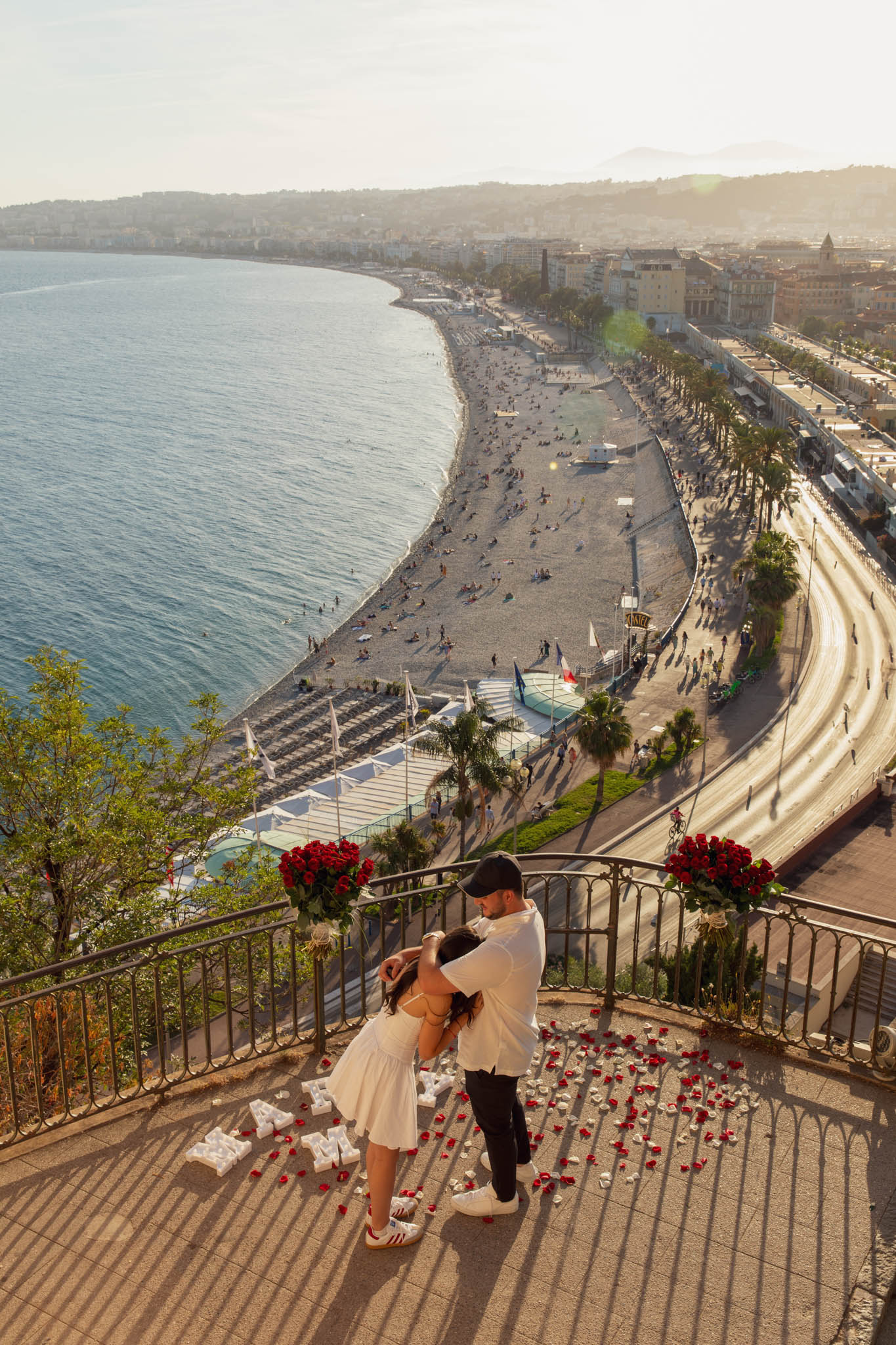 J knew from the start that he wanted to propose to A at sunset, and he wanted it to be in Nice. One of the very best places for sunset in the city is the viewpoint at Colline du Château that faces the Promenade des Anglais. Reached by climbing four flights of stairs, this spot offers an unobstructed view over the Mediterranean, with the sun slowly dropping behind the hills of Nice. As the light softens, the beach, the promenade, and the water below are washed in warm golden tones, with reflections shimmering across the sea. The sky gradually shifts from bright blue to soft amber, creating a calm and romantic atmosphere that feels timeless and unforgettable. This proposal took place between 19:00 and 21:00, timed carefully as the garden closes at 20:00, allowing us enough time to enjoy the location and the light before the gates closed.