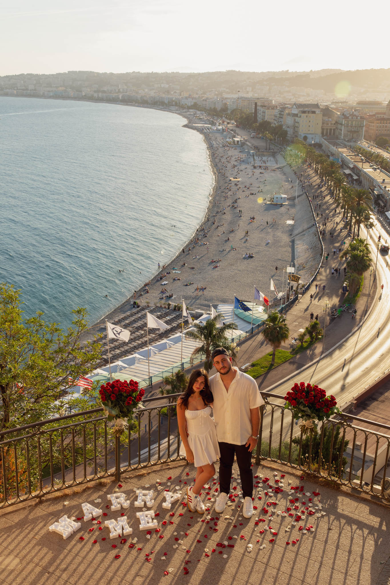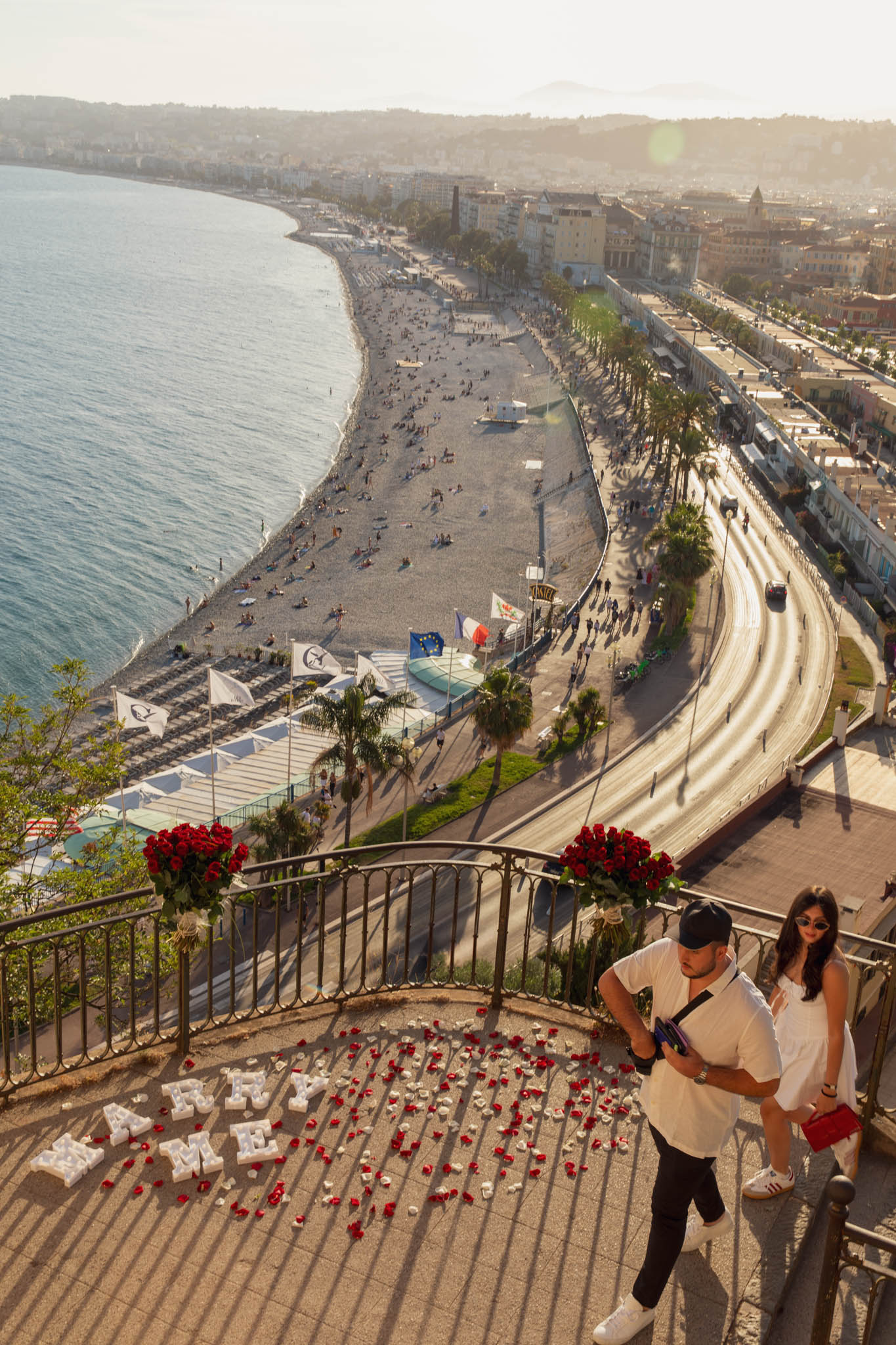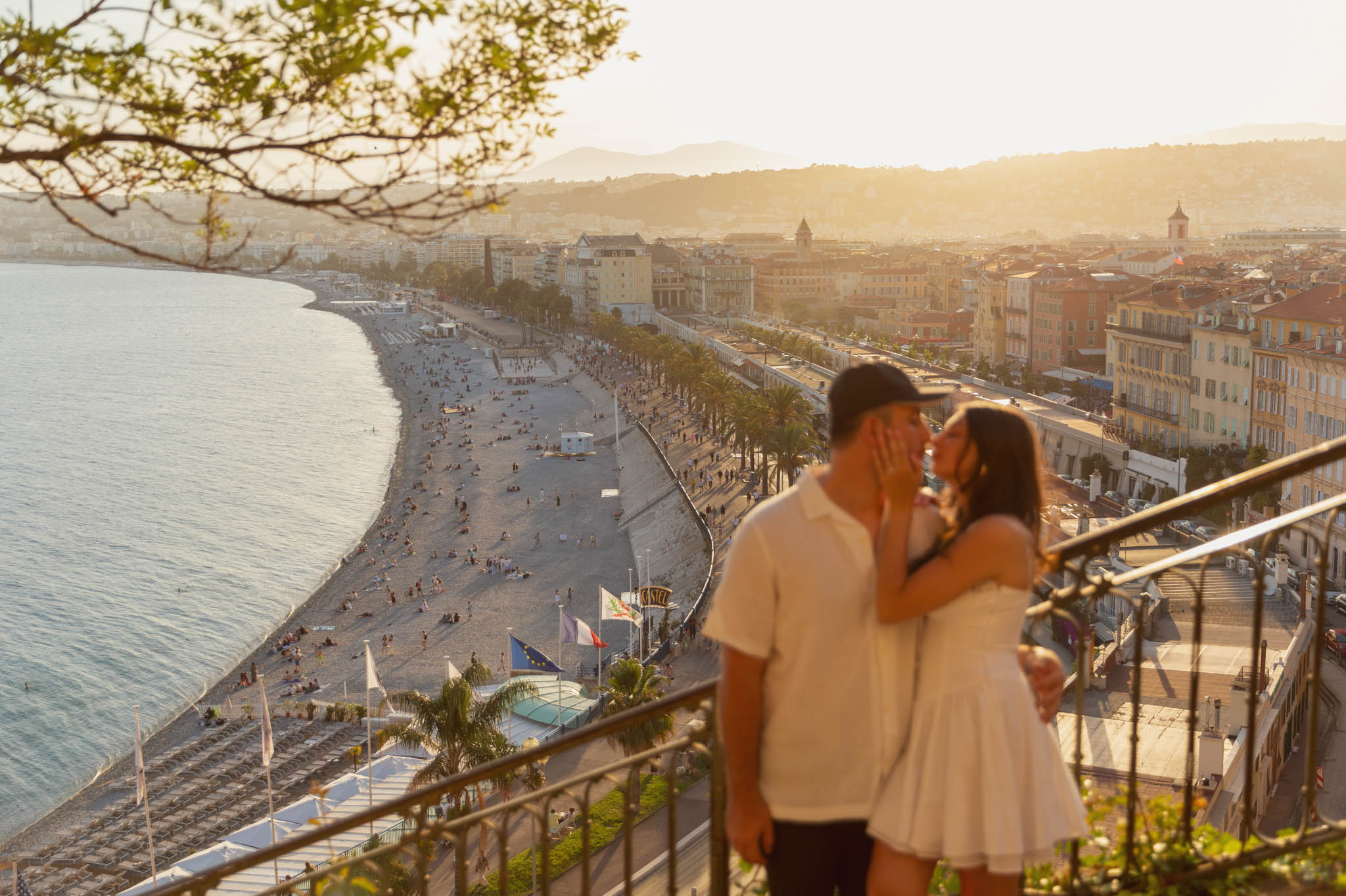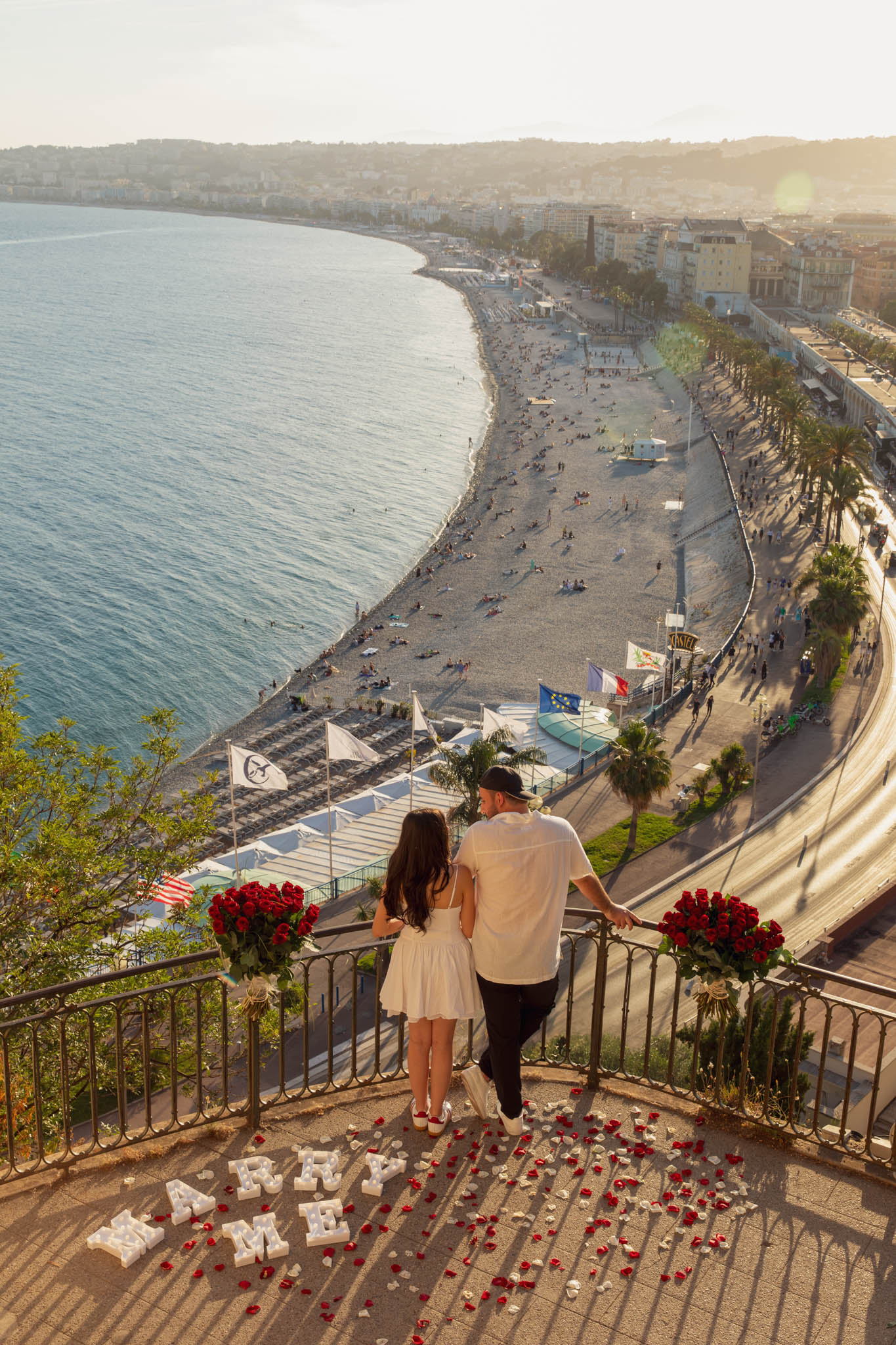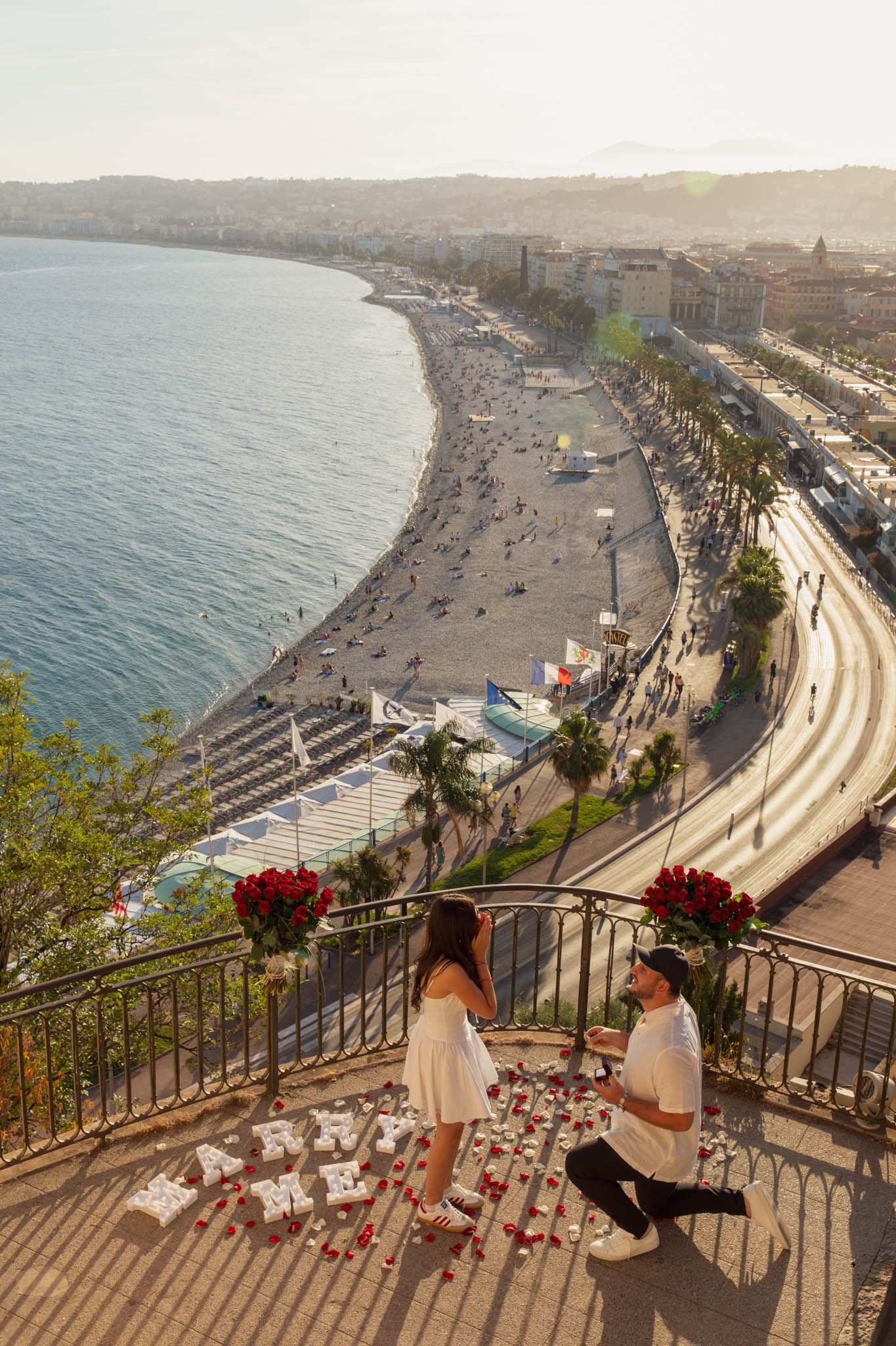 J knew from the start that he wanted to propose to A at sunset, and he wanted it to be in Nice. One of the very best places for sunset in the city is the viewpoint at Colline du Château that faces the Promenade des Anglais. Reached by climbing four flights of stairs, this spot offers an unobstructed view over the Mediterranean, with the sun slowly dropping behind the hills of Nice. As the light softens, the beach, the promenade, and the water below are washed in warm golden tones, with reflections shimmering across the sea. The sky gradually shifts from bright blue to soft amber, creating a calm and romantic atmosphere that feels timeless and unforgettable. This proposal took place between 19:00 and 21:00, timed carefully as the garden closes at 20:00, allowing us enough time to enjoy the location and the light before the gates closed.