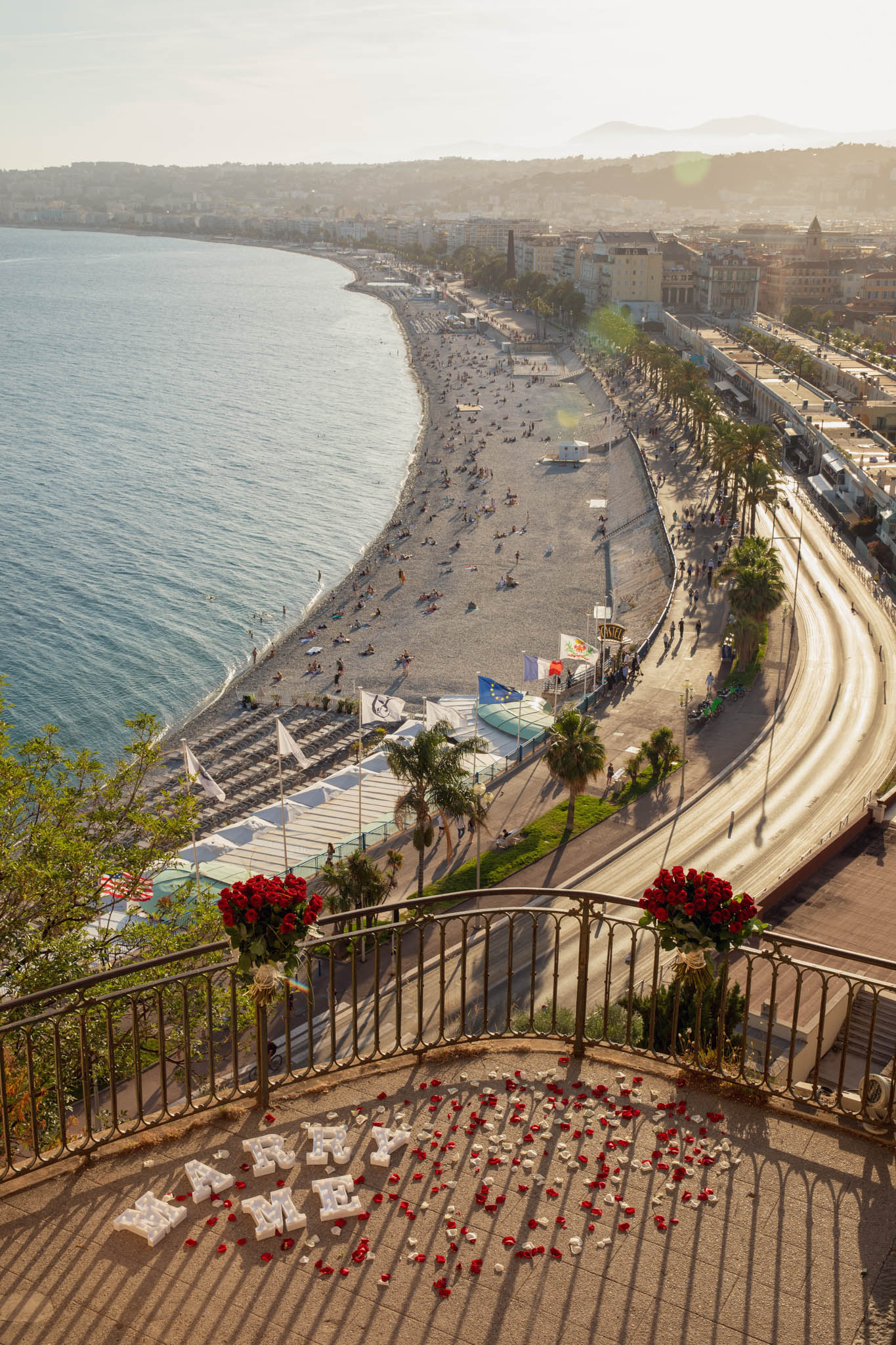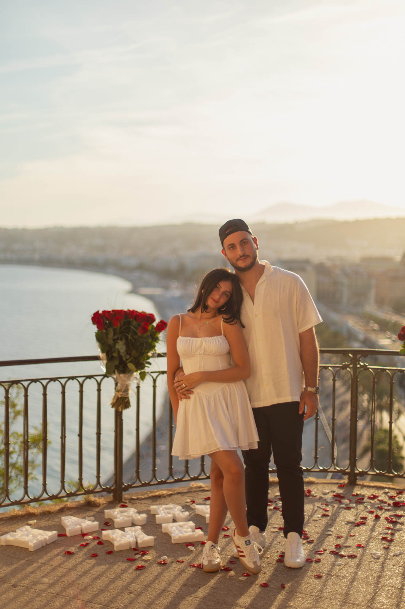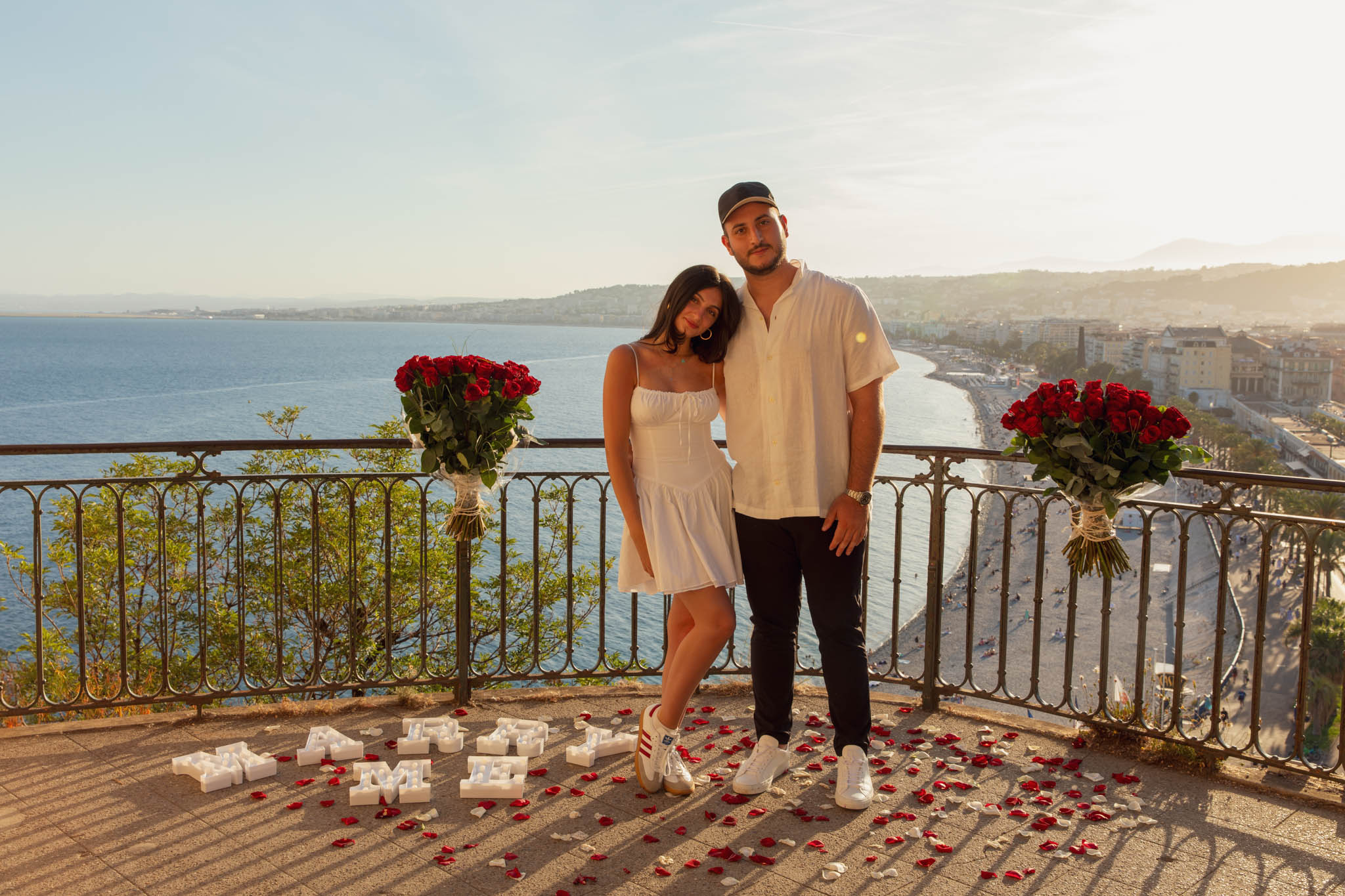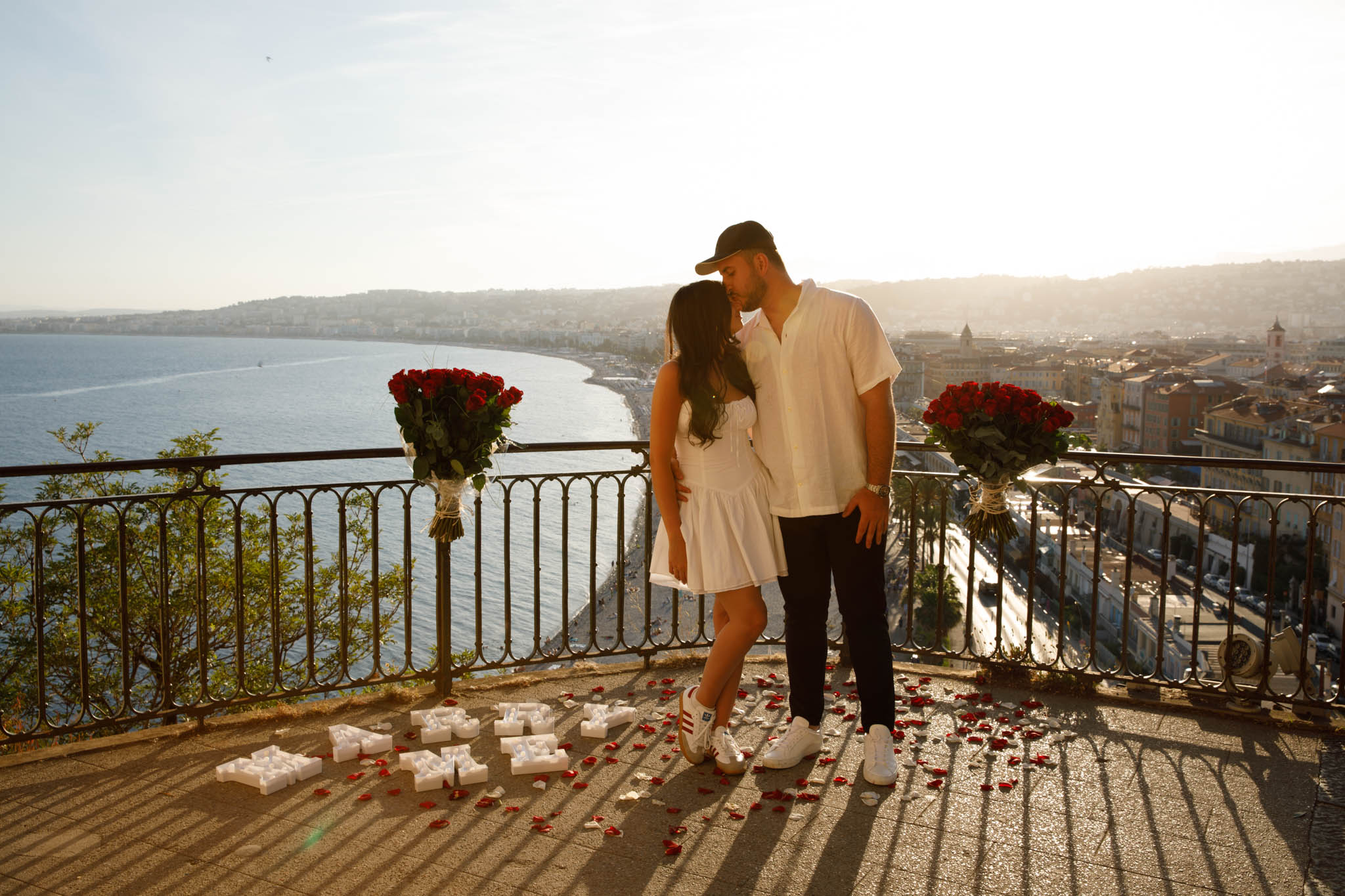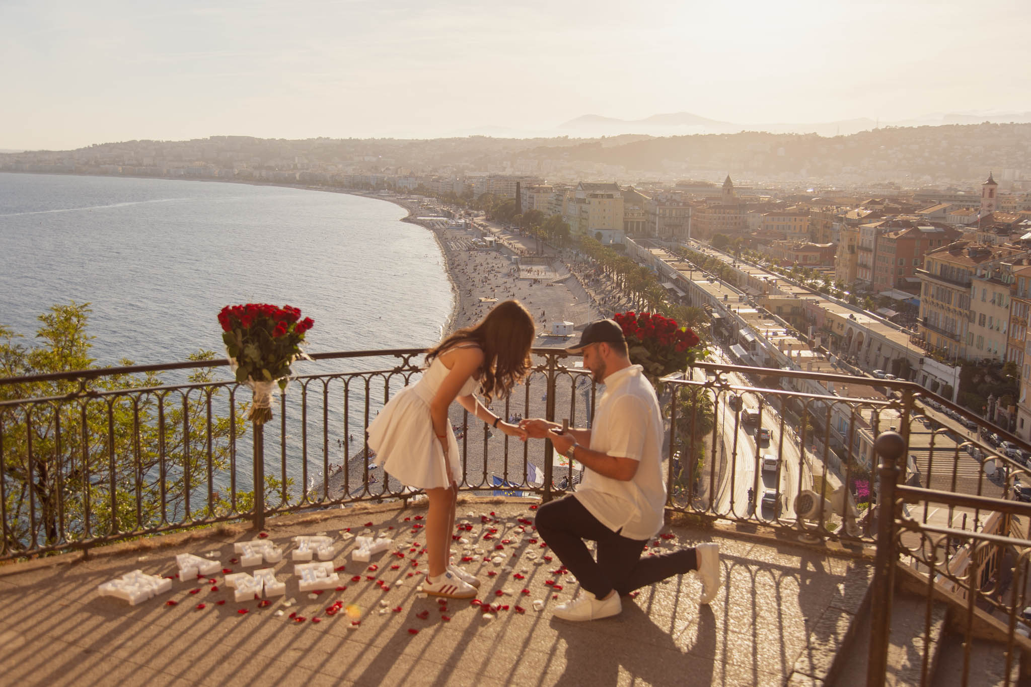 J knew from the start that he wanted to propose to A at sunset, and he wanted it to be in Nice. One of the very best places for sunset in the city is the viewpoint at Colline du Château that faces the Promenade des Anglais. Reached by climbing four flights of stairs, this spot offers an unobstructed view over the Mediterranean, with the sun slowly dropping behind the hills of Nice. As the light softens, the beach, the promenade, and the water below are washed in warm golden tones, with reflections shimmering across the sea. The sky gradually shifts from bright blue to soft amber, creating a calm and romantic atmosphere that feels timeless and unforgettable. This proposal took place between 19:00 and 21:00, timed carefully as the garden closes at 20:00, allowing us enough time to enjoy the location and the light before the gates closed.