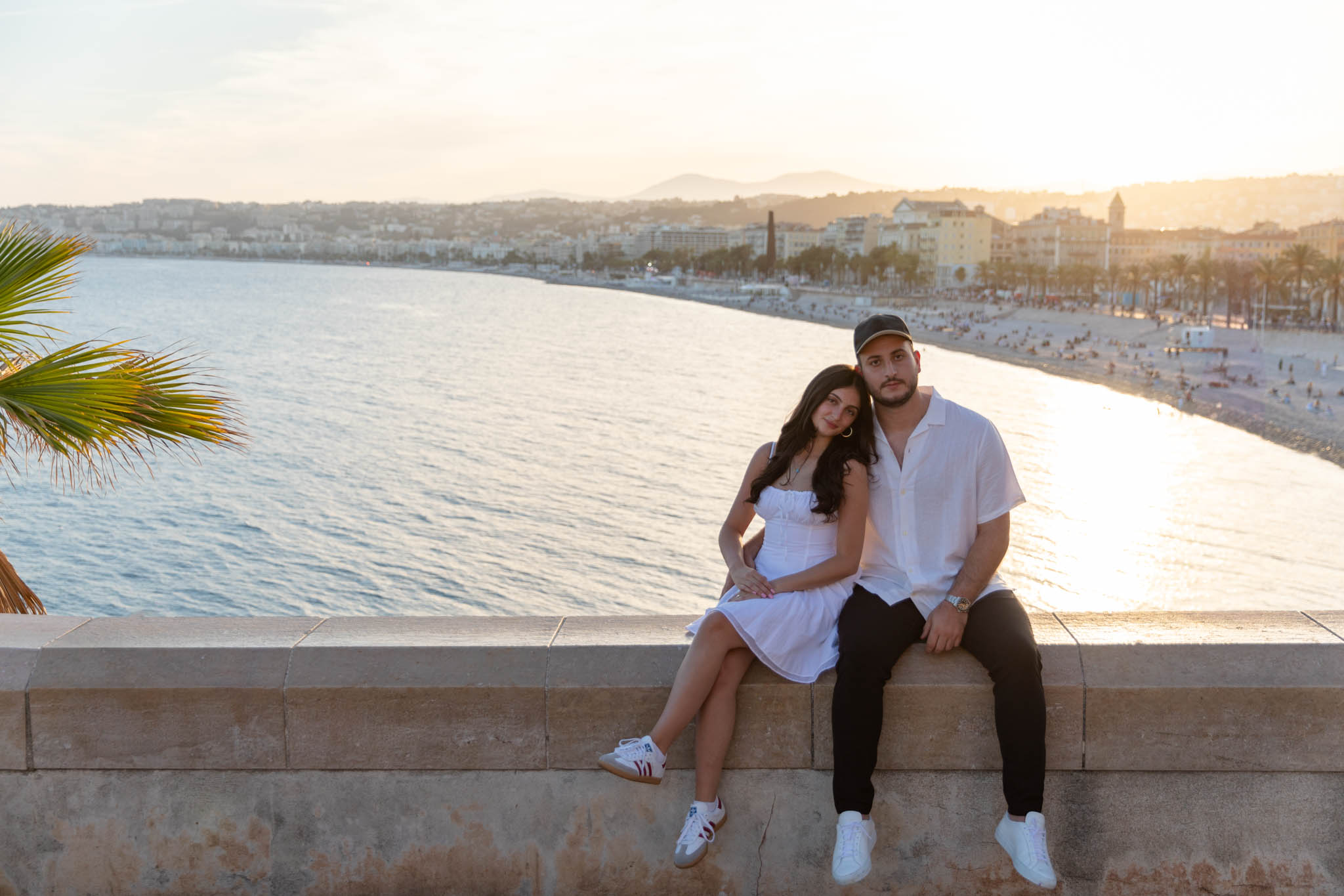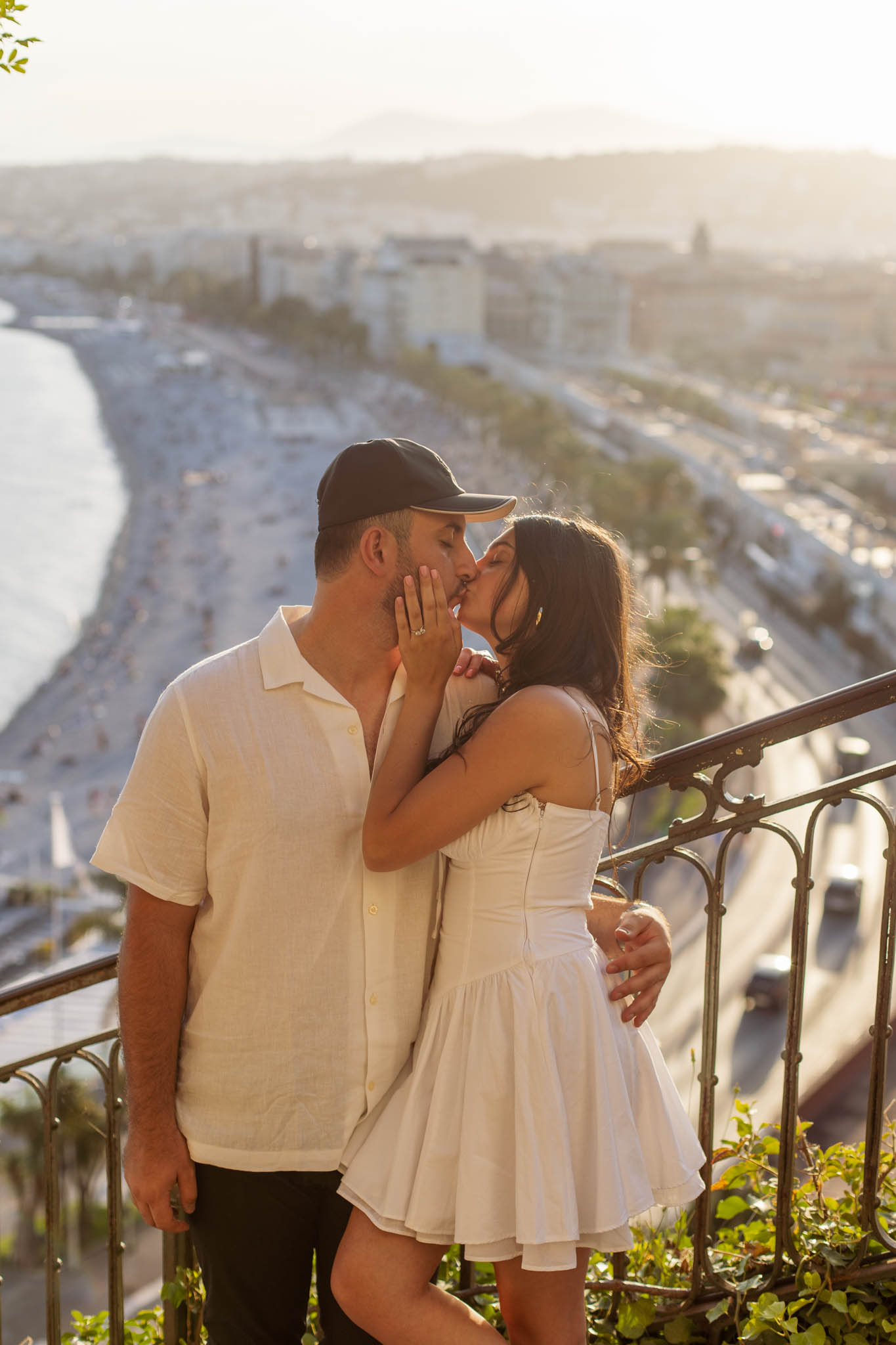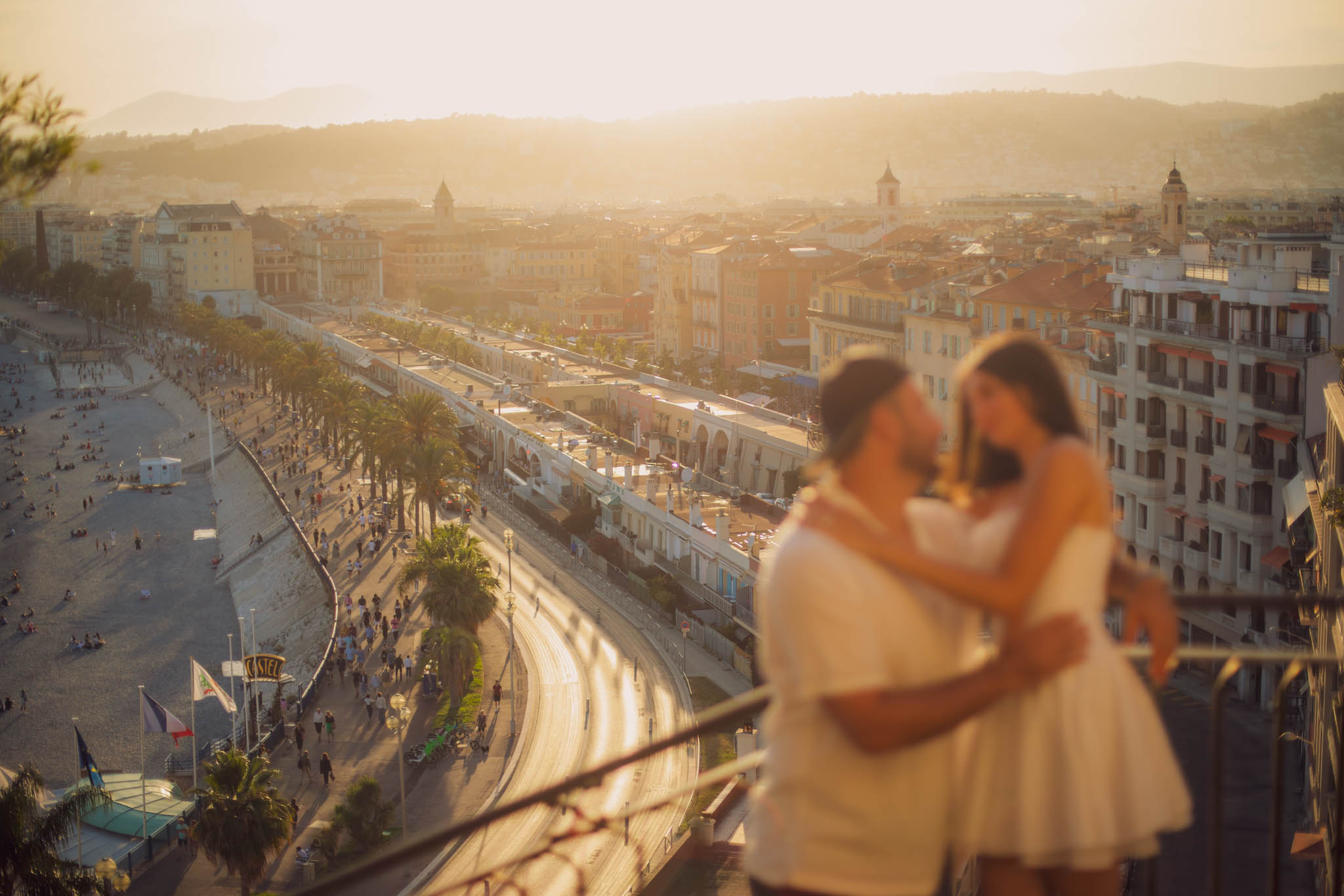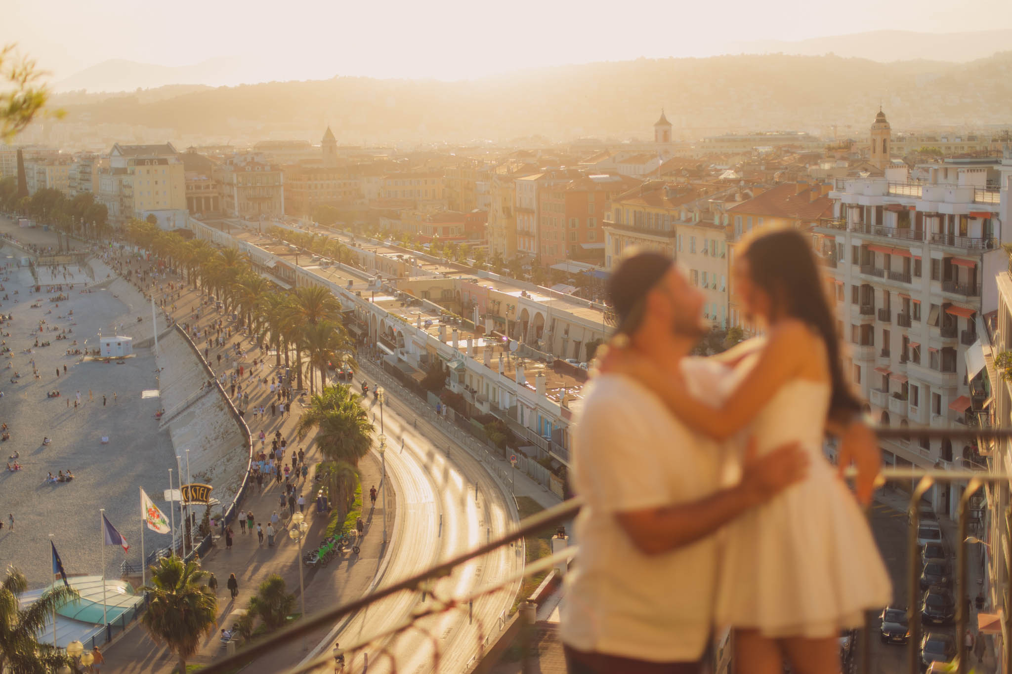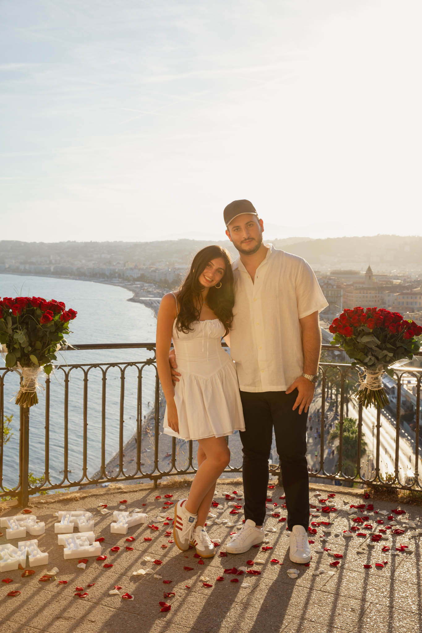 J knew from the start that he wanted to propose to A at sunset, and he wanted it to be in Nice. One of the very best places for sunset in the city is the viewpoint at Colline du Château that faces the Promenade des Anglais. Reached by climbing four flights of stairs, this spot offers an unobstructed view over the Mediterranean, with the sun slowly dropping behind the hills of Nice. As the light softens, the beach, the promenade, and the water below are washed in warm golden tones, with reflections shimmering across the sea. The sky gradually shifts from bright blue to soft amber, creating a calm and romantic atmosphere that feels timeless and unforgettable. This proposal took place between 19:00 and 21:00, timed carefully as the garden closes at 20:00, allowing us enough time to enjoy the location and the light before the gates closed.