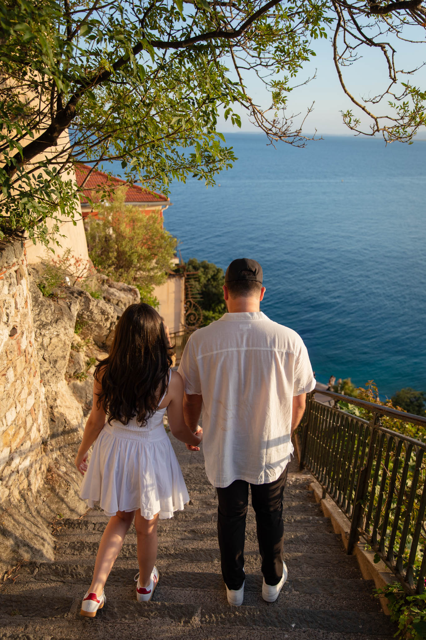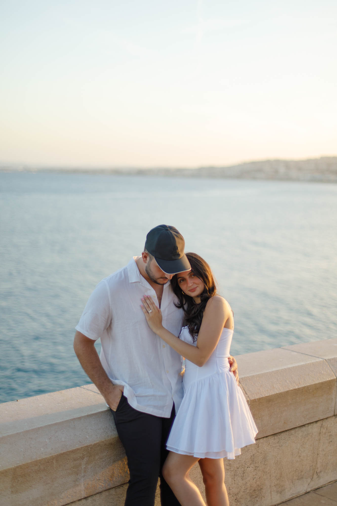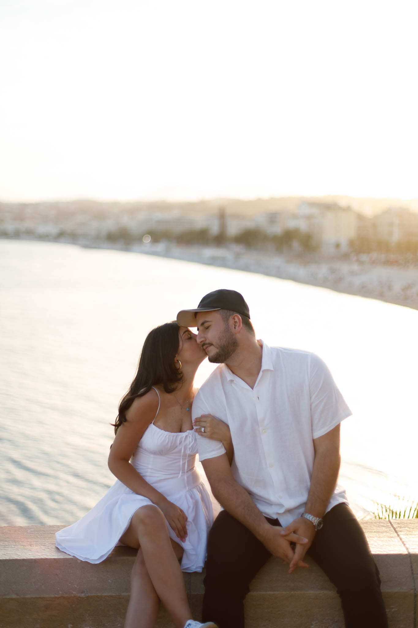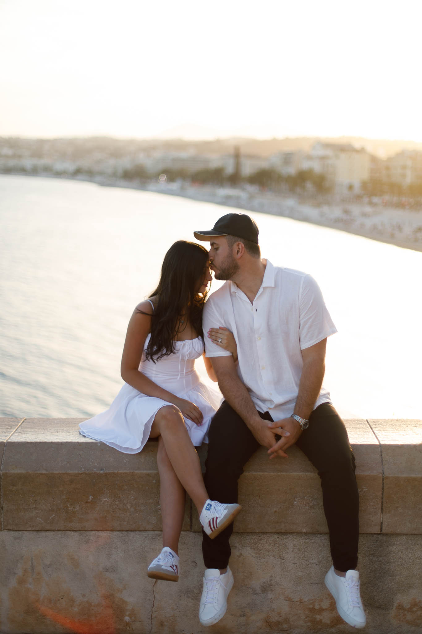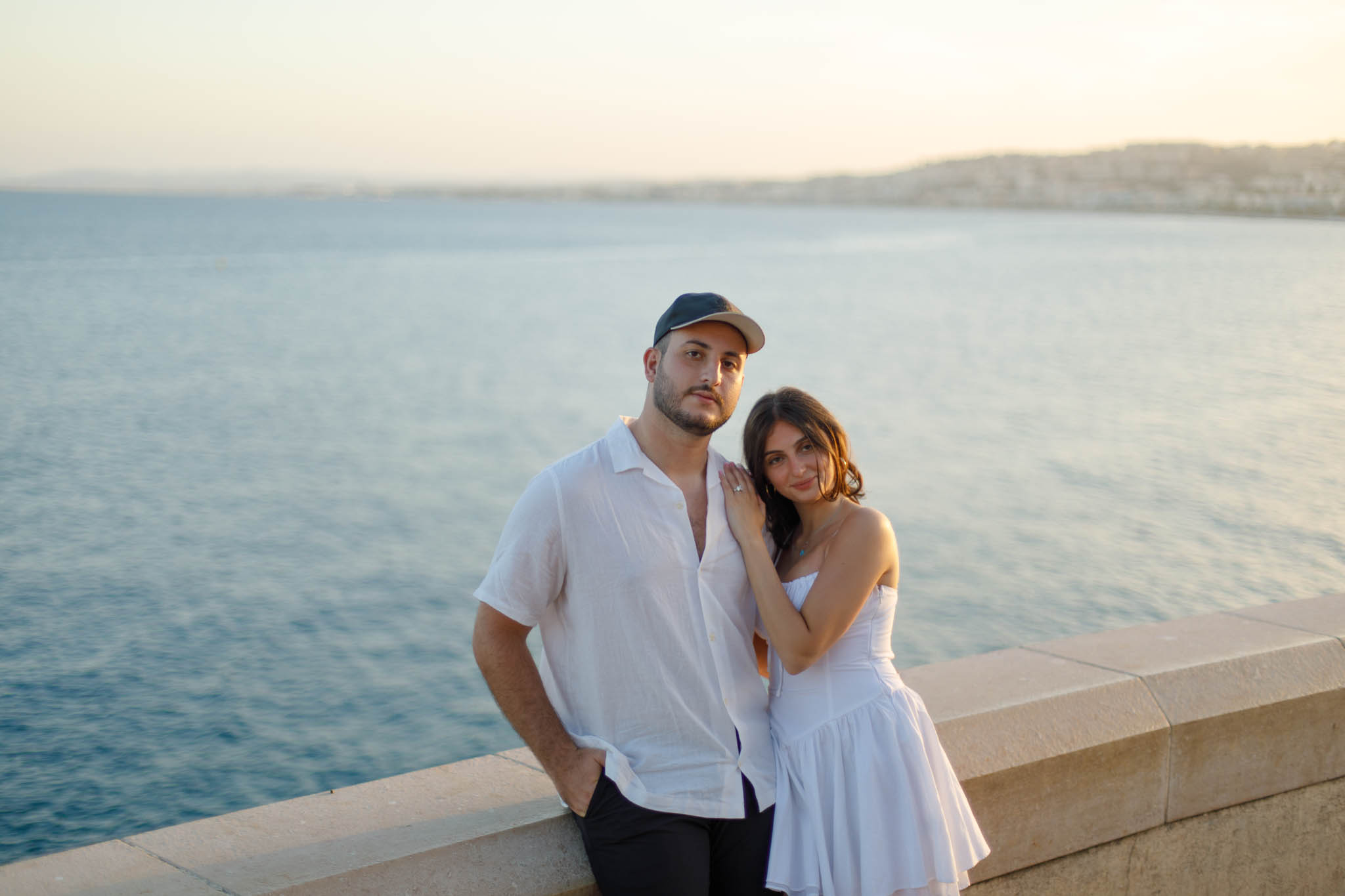 J knew from the start that he wanted to propose to A at sunset, and he wanted it to be in Nice. One of the very best places for sunset in the city is the viewpoint at Colline du Château that faces the Promenade des Anglais. Reached by climbing four flights of stairs, this spot offers an unobstructed view over the Mediterranean, with the sun slowly dropping behind the hills of Nice. As the light softens, the beach, the promenade, and the water below are washed in warm golden tones, with reflections shimmering across the sea. The sky gradually shifts from bright blue to soft amber, creating a calm and romantic atmosphere that feels timeless and unforgettable. This proposal took place between 19:00 and 21:00, timed carefully as the garden closes at 20:00, allowing us enough time to enjoy the location and the light before the gates closed.