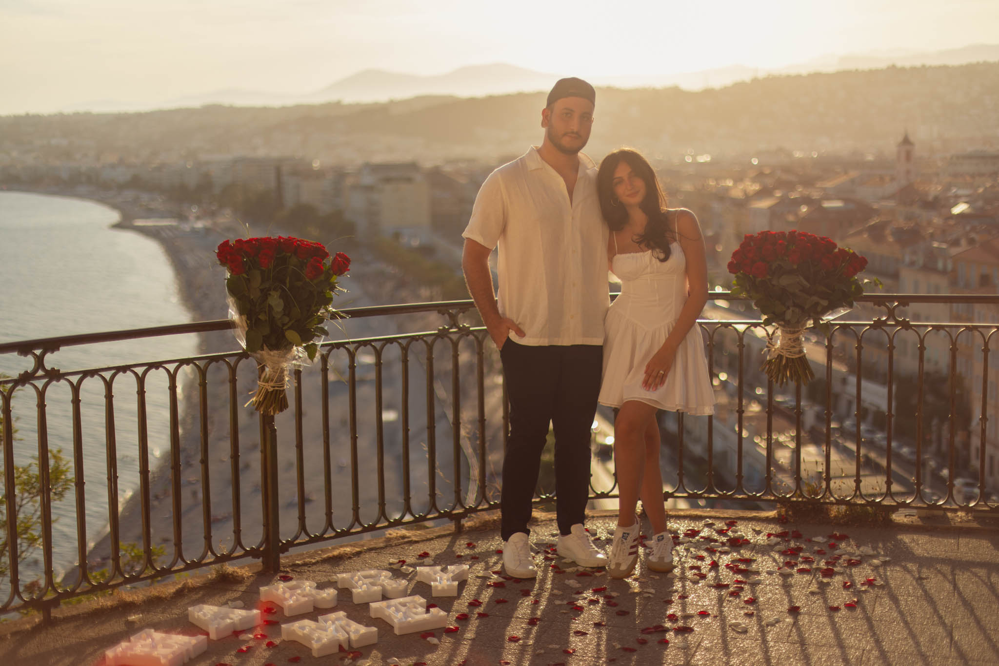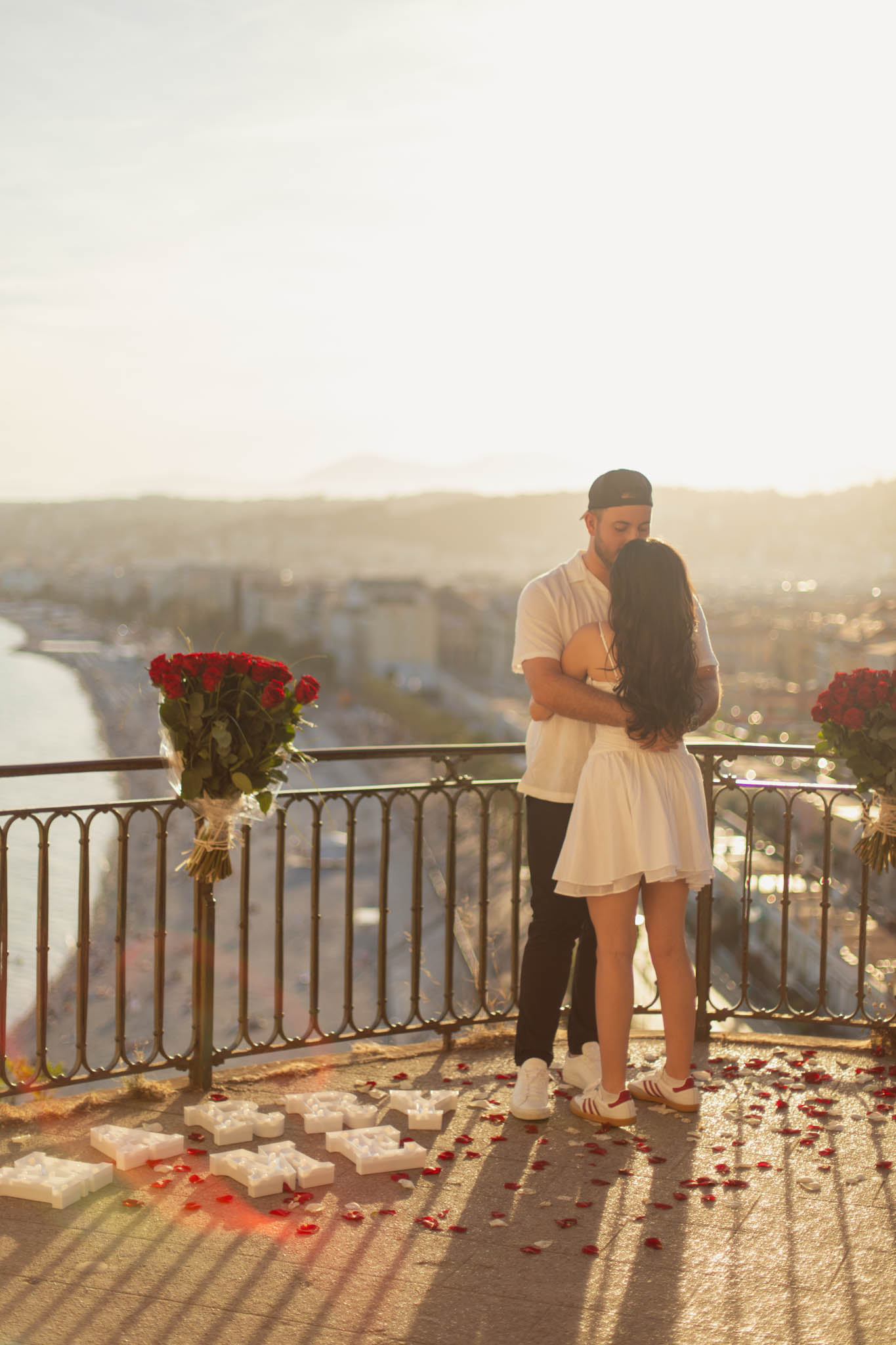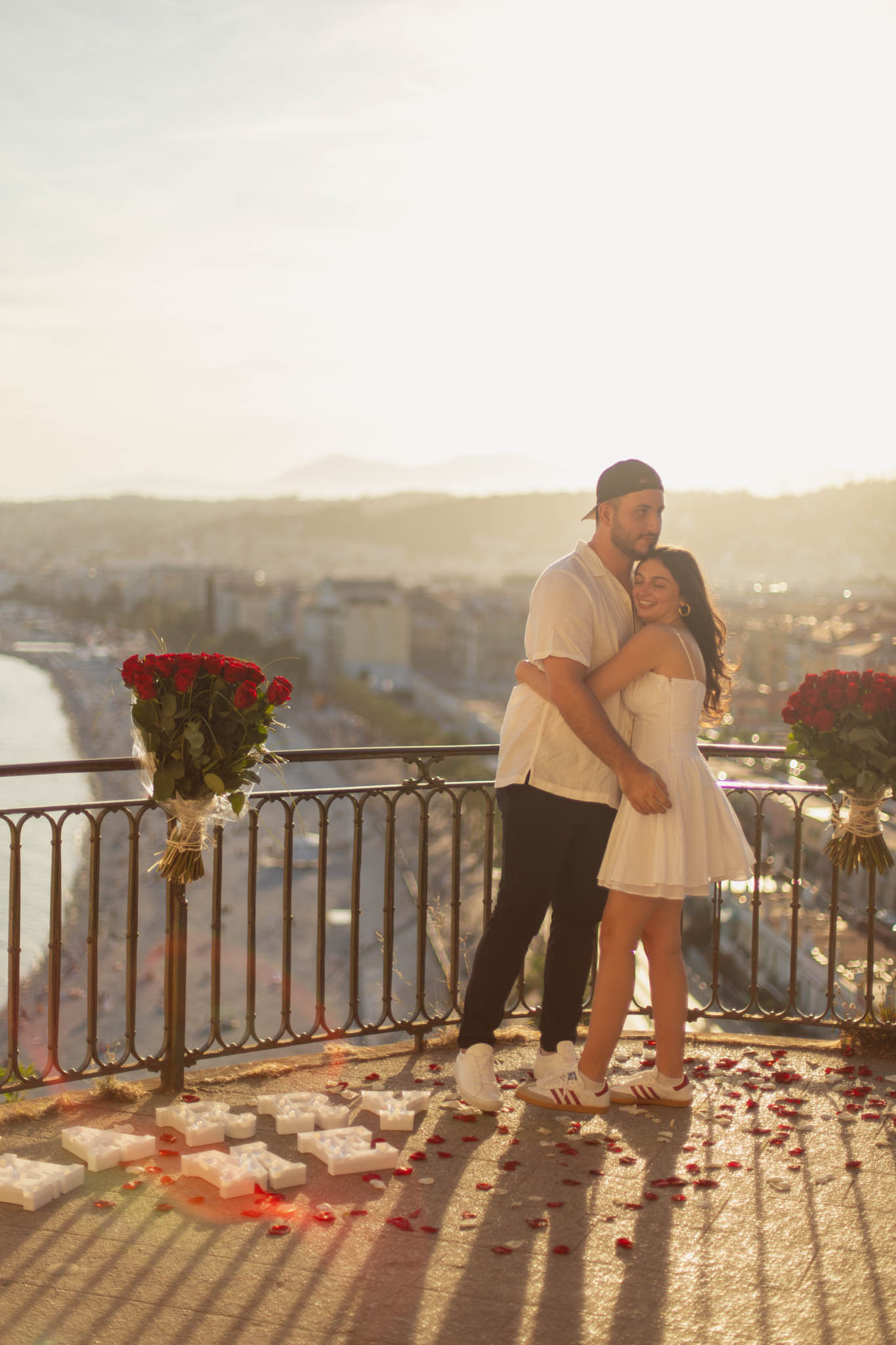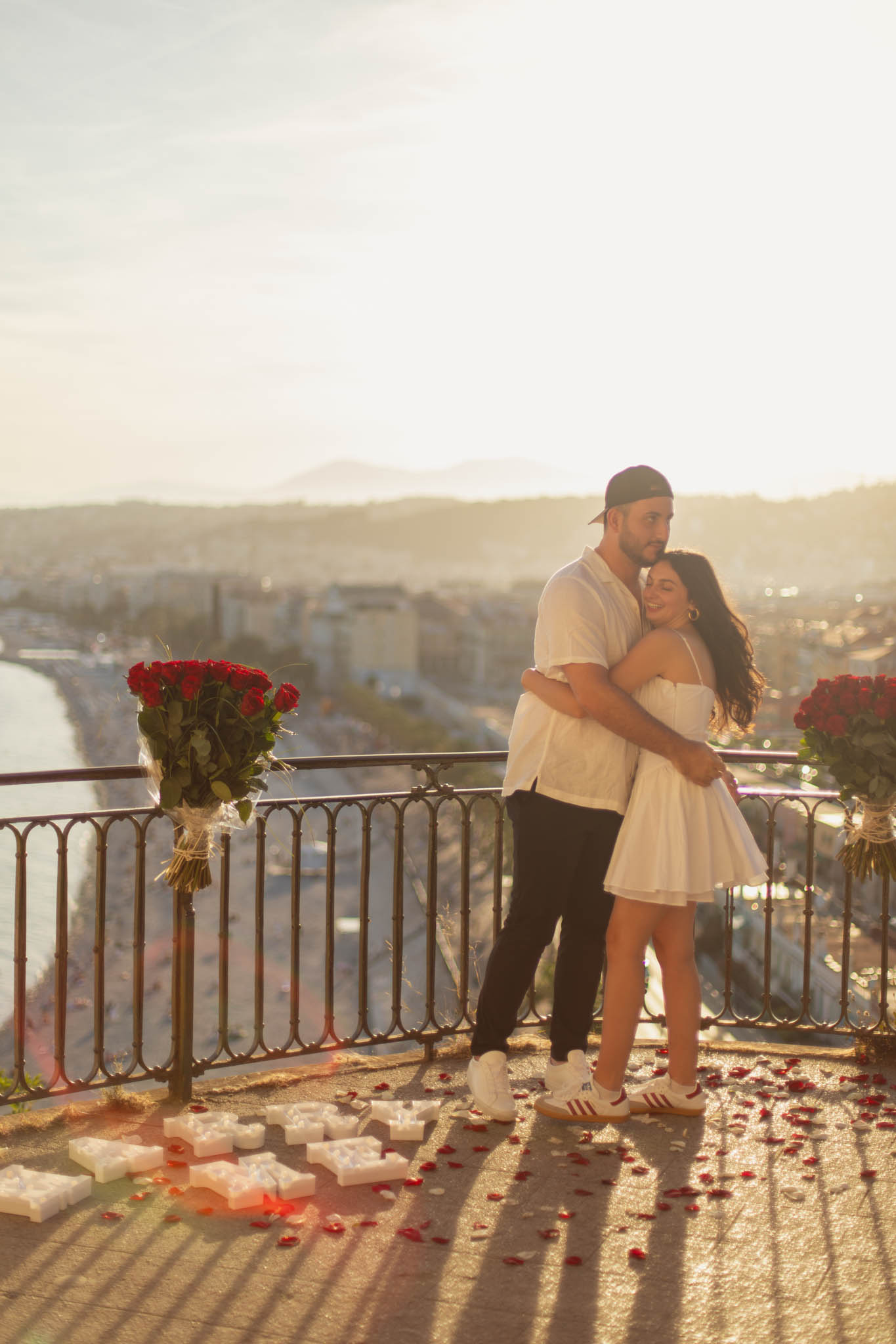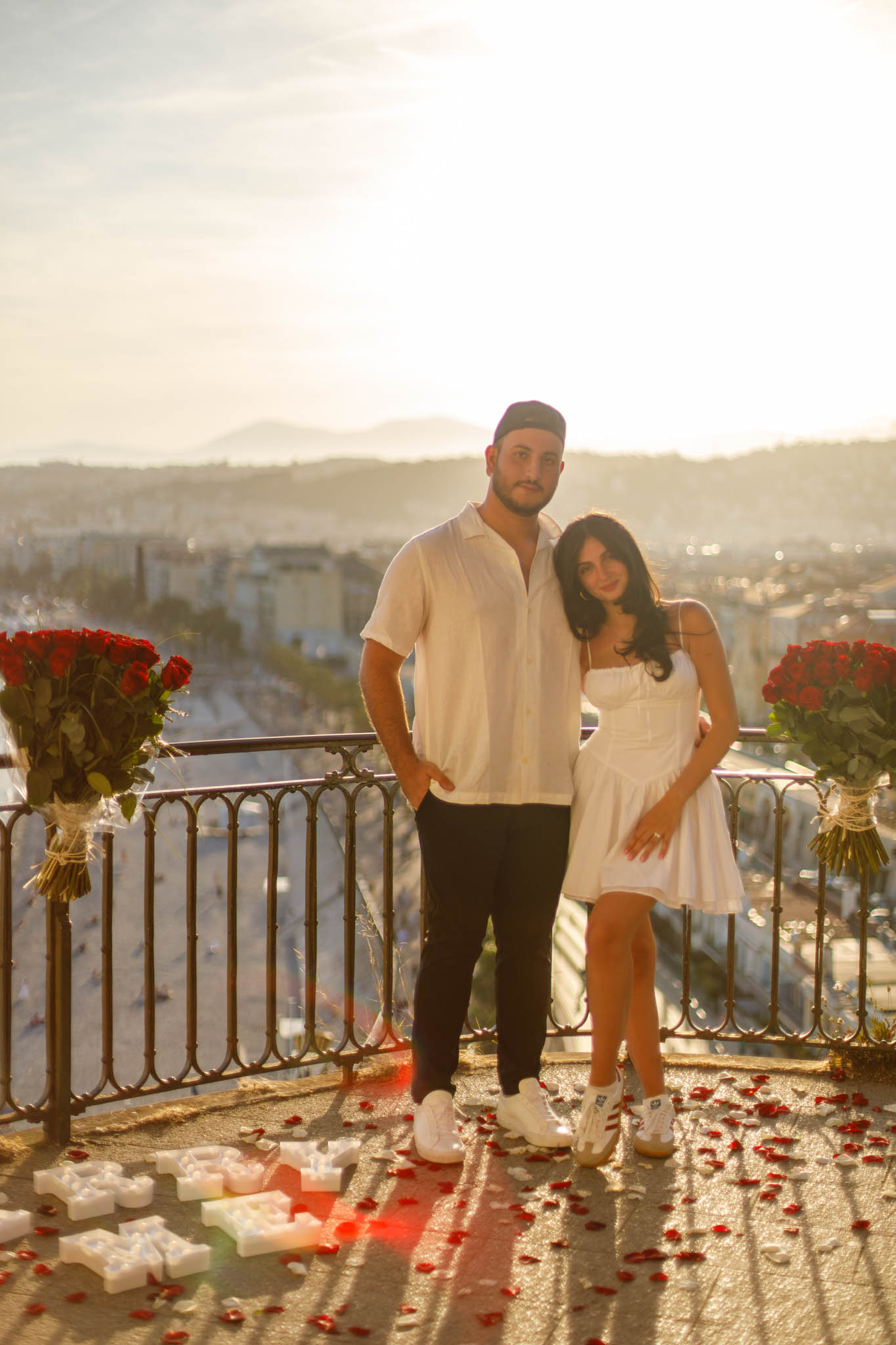J also wanted a decorative setup that would feel elegant and intentional, while still standing out against the sunset colours. We chose two very large rose bouquets, placed side by side along the railing of the viewpoint, framing the scene beautifully. Along with the bouquets, we added “Marry Me” letters and matching red and white rose petals scattered on the ground. The setup was simple, refined, and perfectly balanced with the dramatic view behind it.