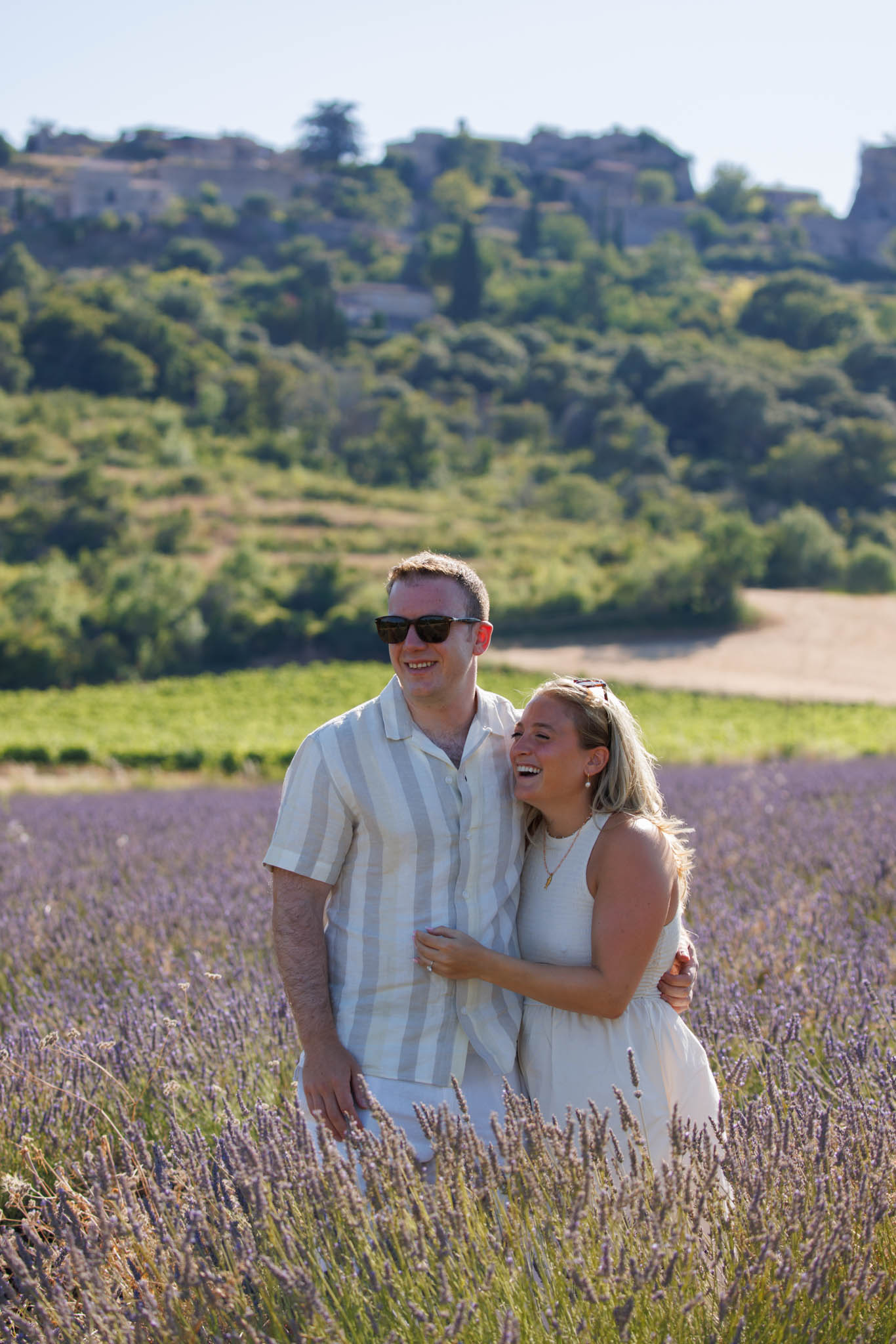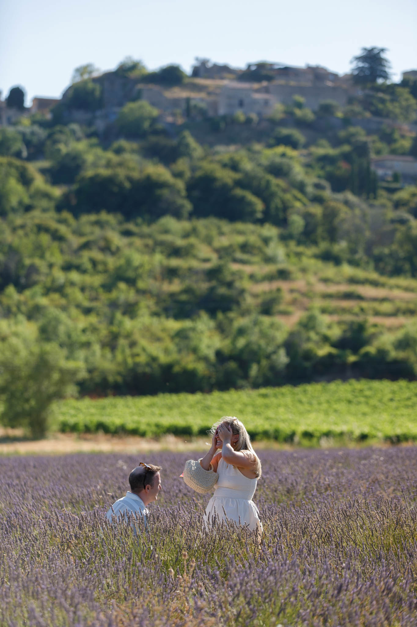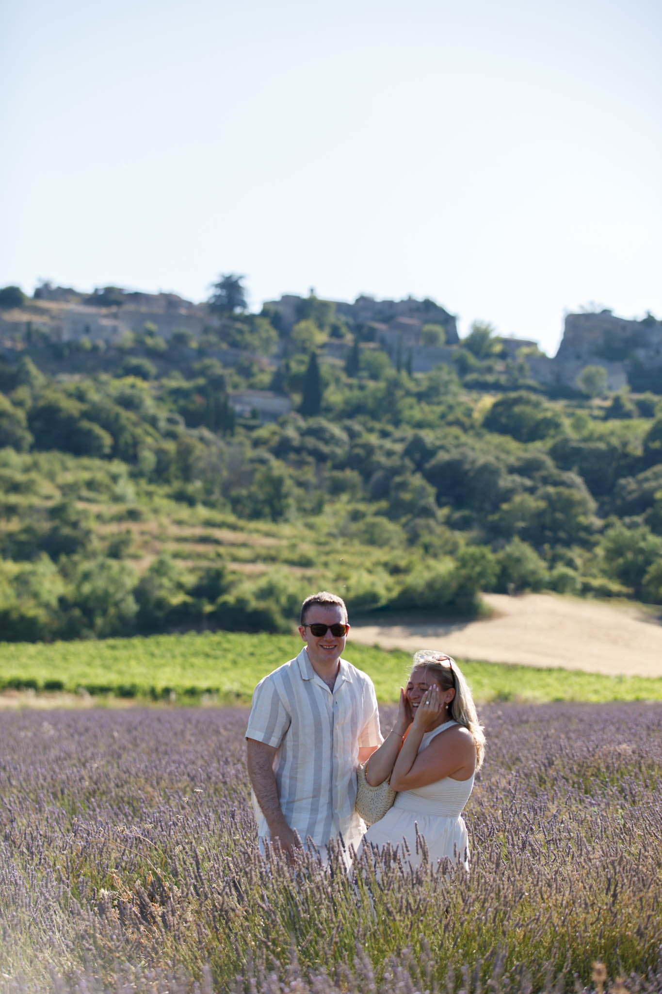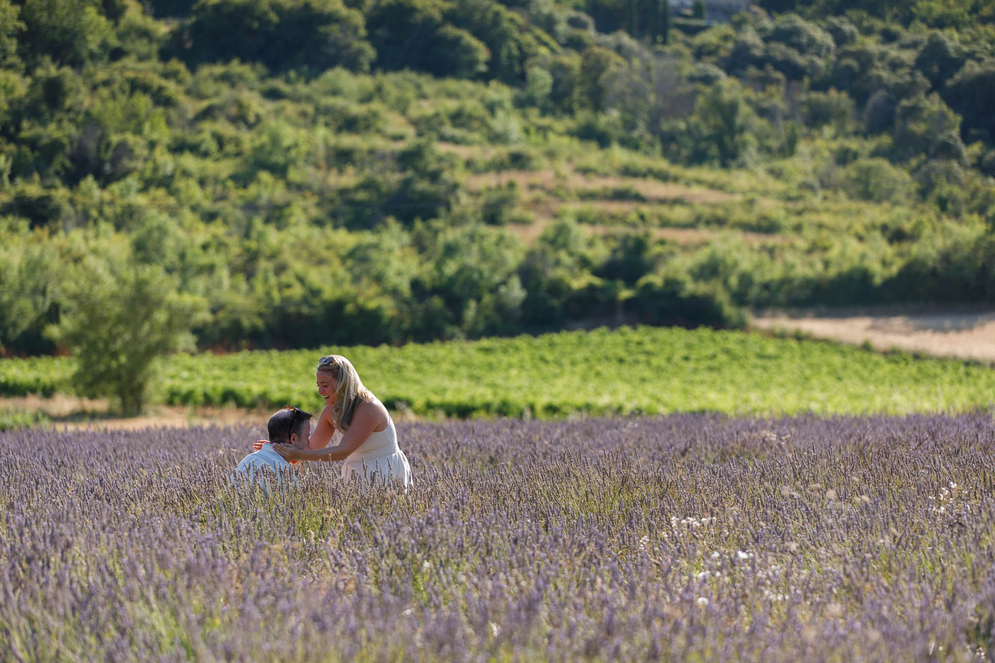 C reached out to organise a proposal for R in mid-July. Originally, the plan was to shoot in Valensole from 18:00 to 19:00, but due to an unusually hot summer, heat waves, and drought, the lavender fields there were nearly all harvested. We quickly adapted and found a beautiful field just outside Saignon in the Luberon region. It was quiet, private, and perfect for the surprise proposal.
