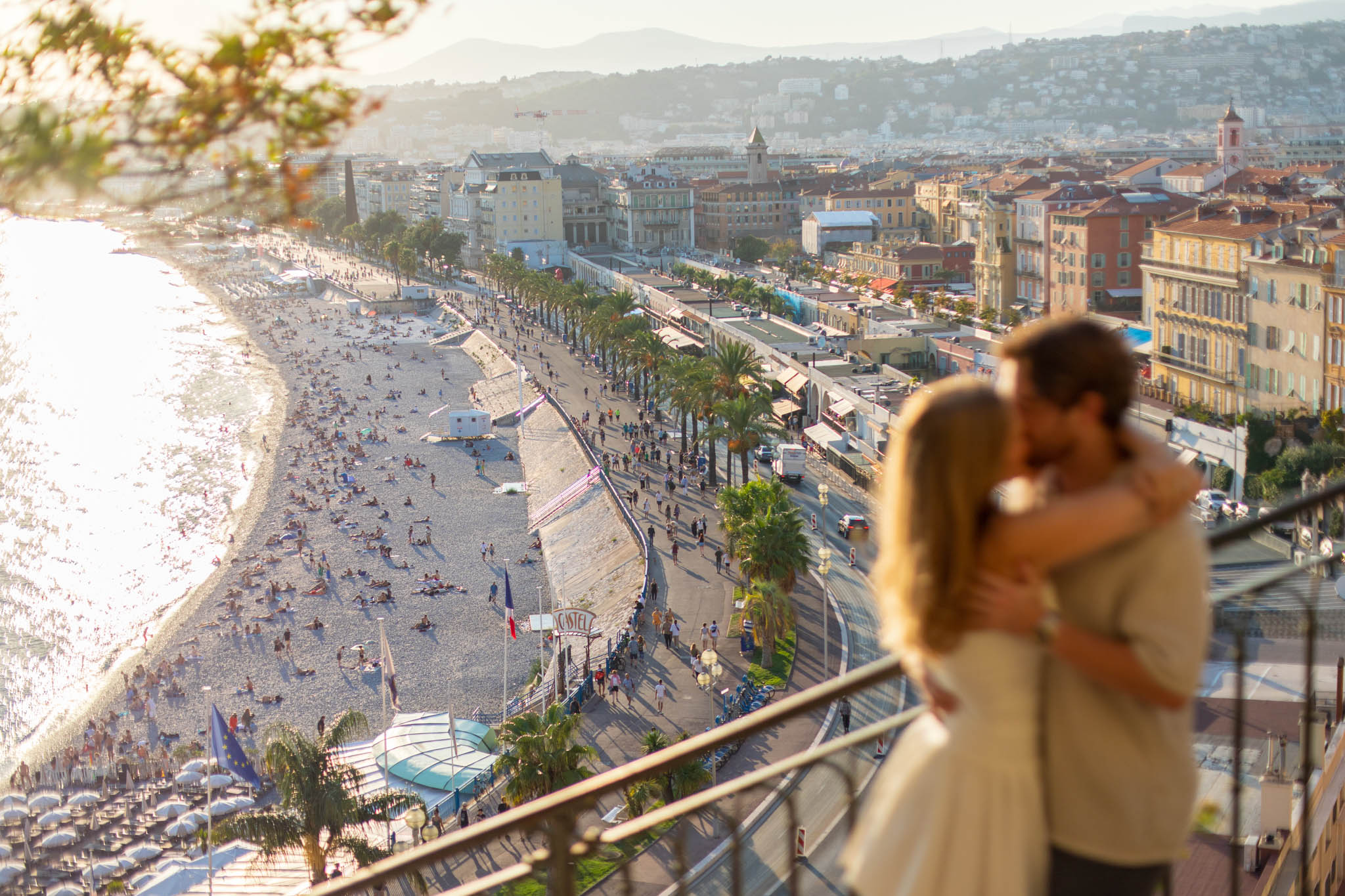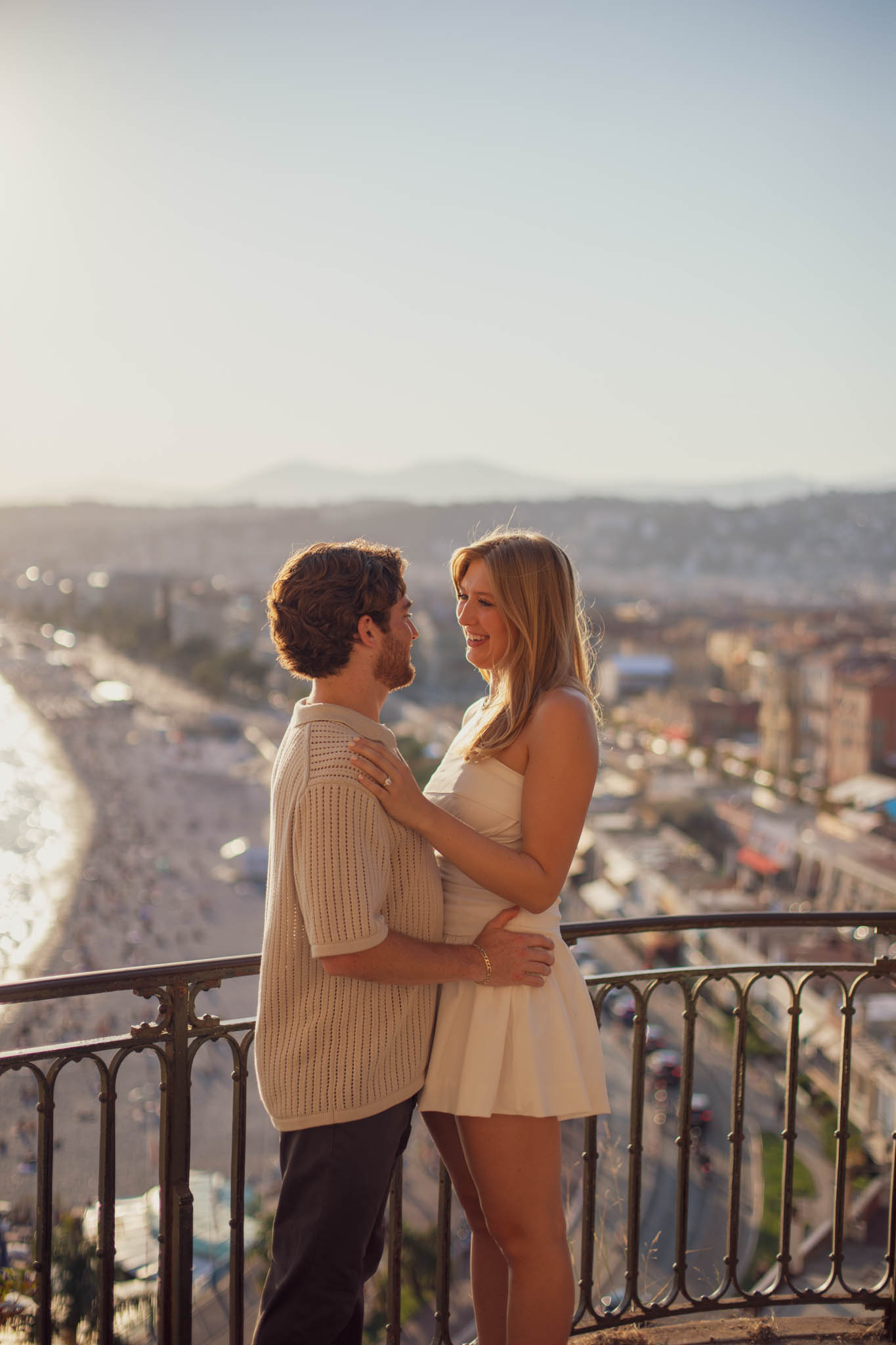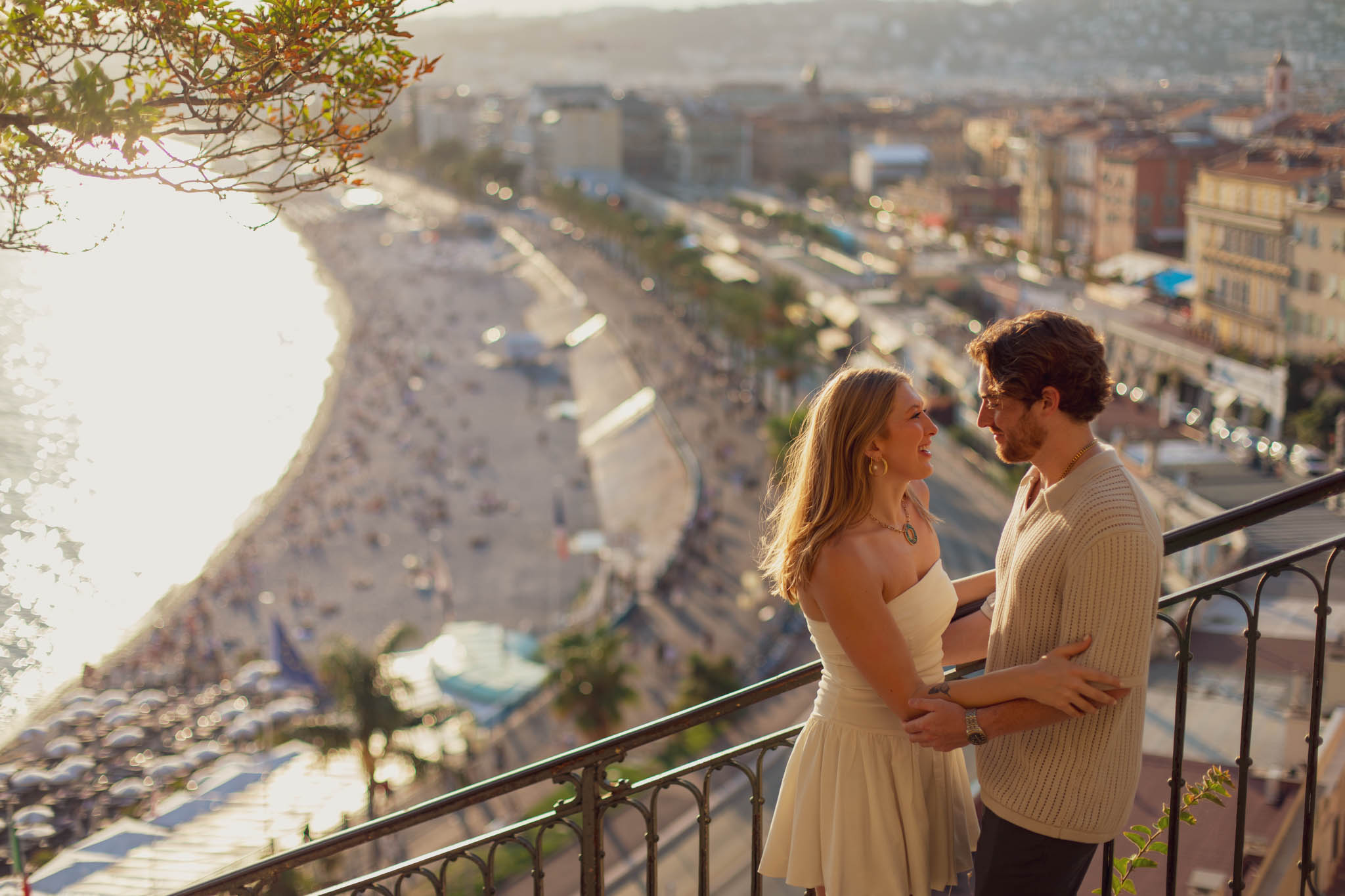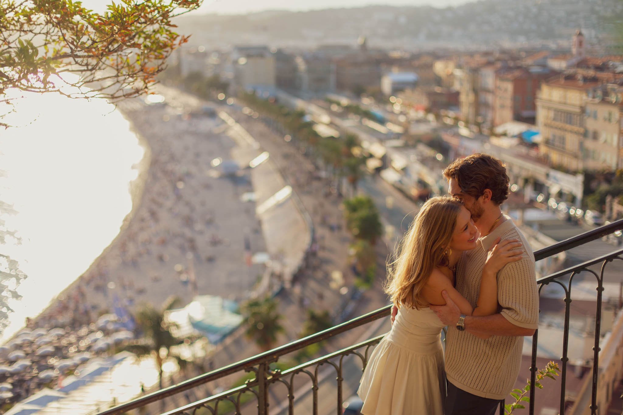 After the proposal, we walked through the surrounding areas to capture more photos. We focused on the side of the Colline du Château that faces the promenade, which catches direct sunlight in the late afternoon. The opposite side, facing Port Lympia, tends to fall in shadow at this time, so we never recommend that view for sunset proposals.