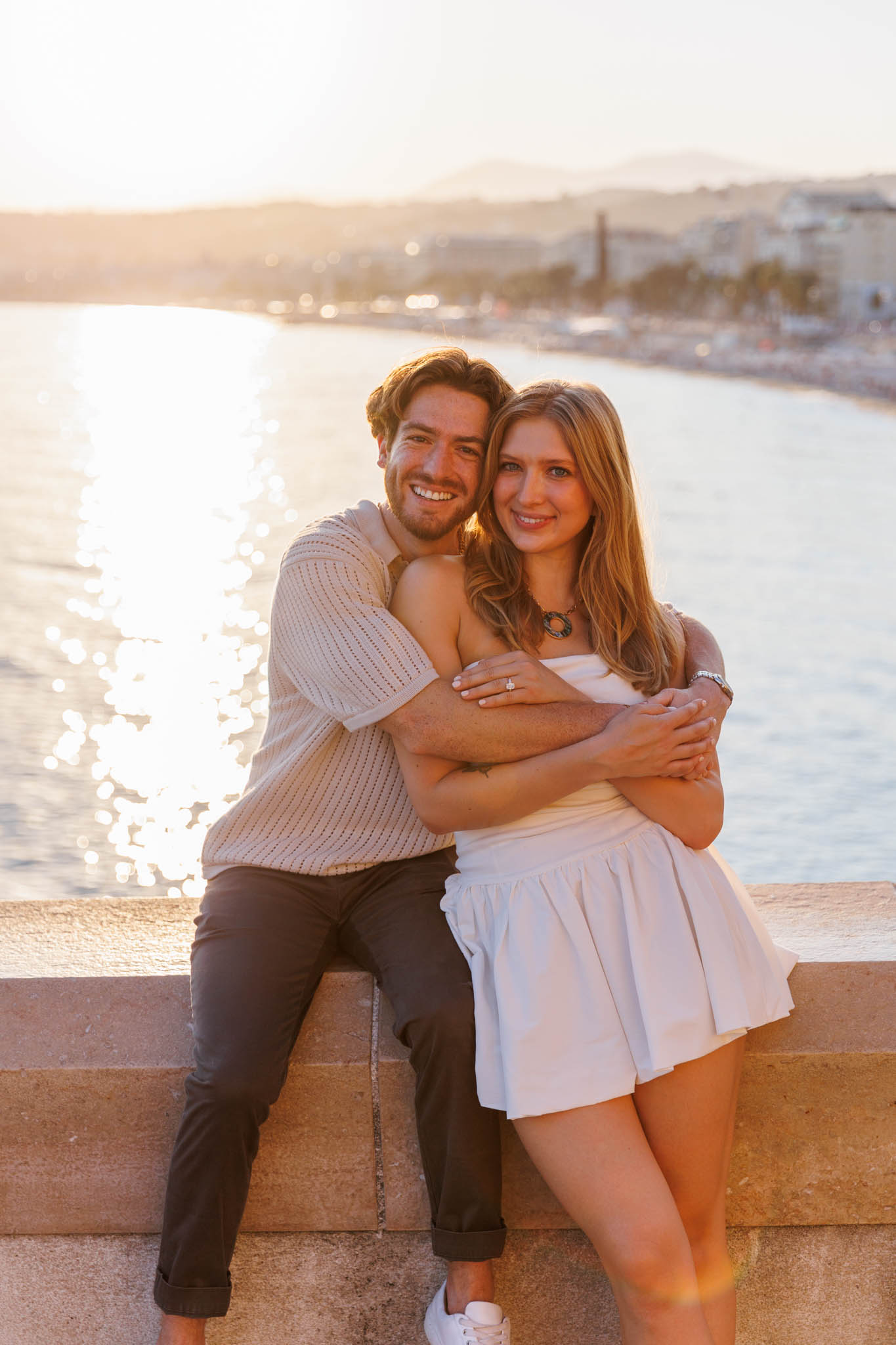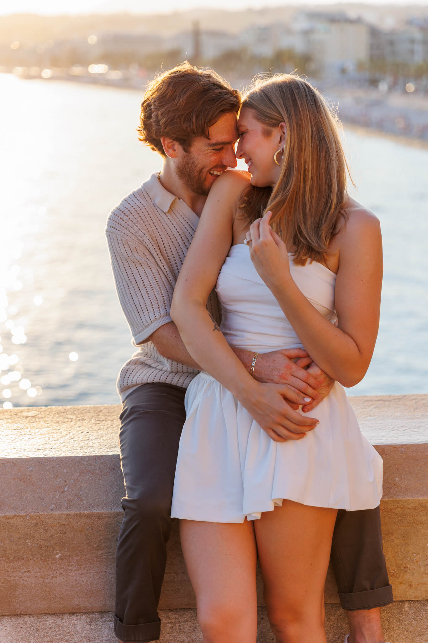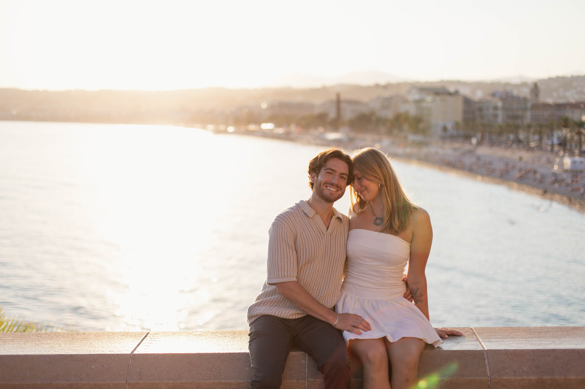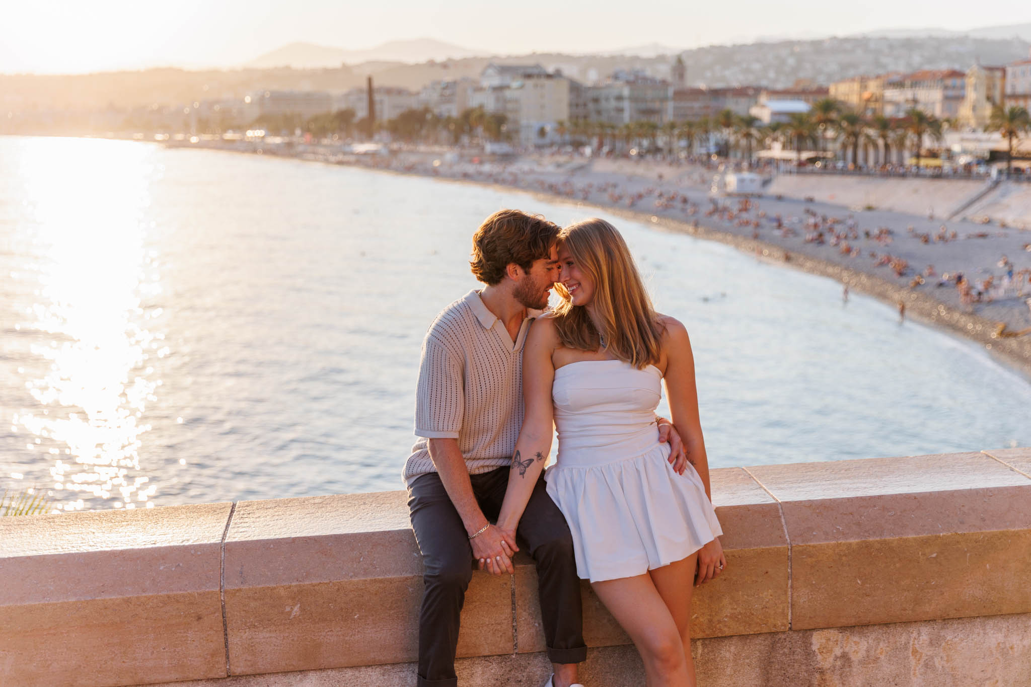 After the proposal, we walked through the surrounding areas to capture more photos. We focused on the side of the Colline du Château that faces the promenade, which catches direct sunlight in the late afternoon. The opposite side, facing Port Lympia, tends to fall in shadow at this time, so we never recommend that view for sunset proposals.