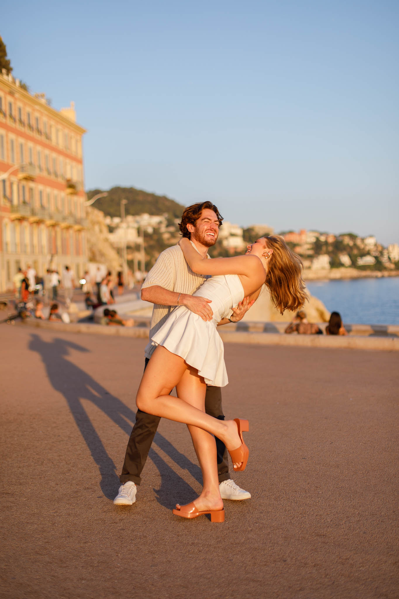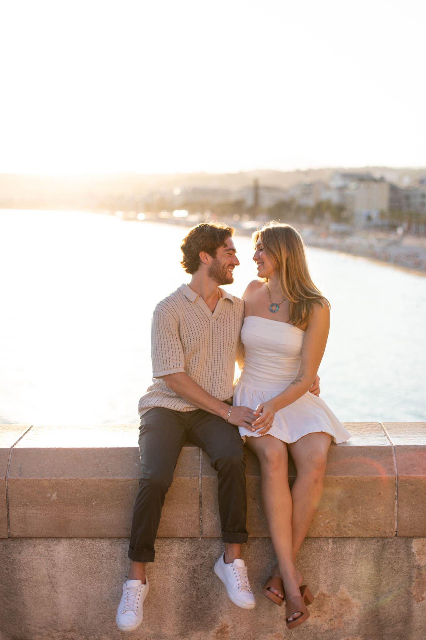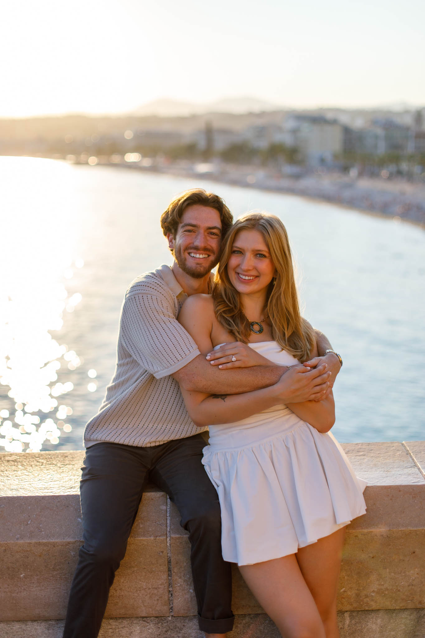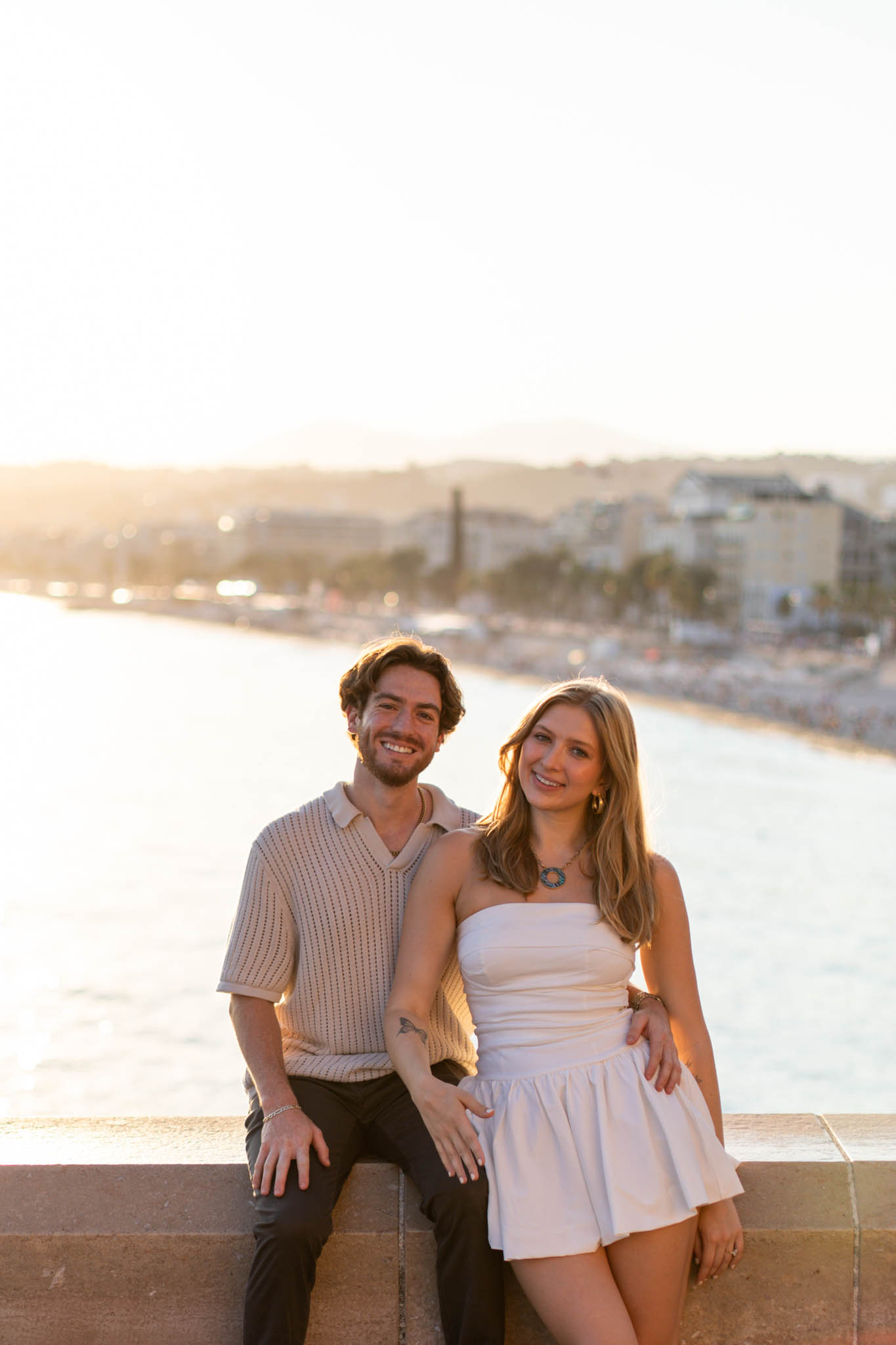 After the proposal, we walked through the surrounding areas to capture more photos. We focused on the side of the Colline du Château that faces the promenade, which catches direct sunlight in the late afternoon. The opposite side, facing Port Lympia, tends to fall in shadow at this time, so we never recommend that view for sunset proposals.
